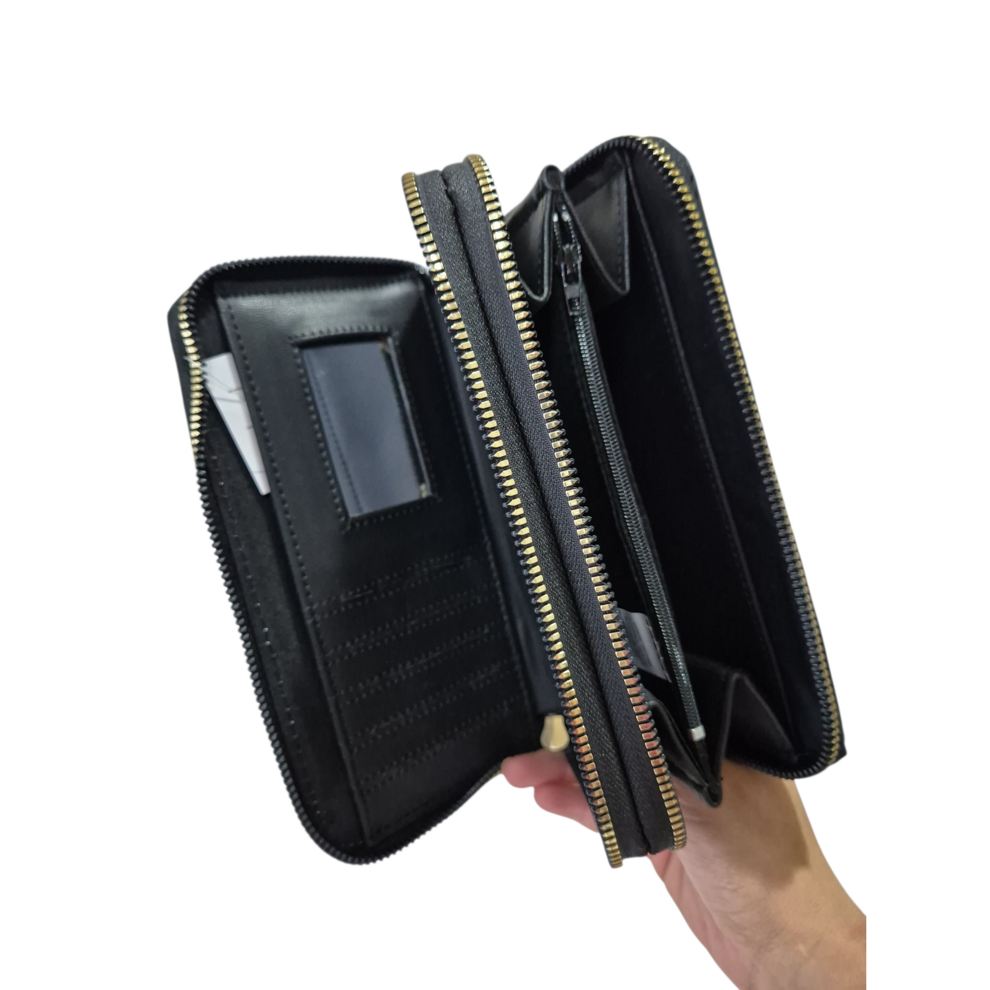 Cuenta con dos cierres independientes que ofrecen mayor organización y seguridad. Incluye 12 espacios para tarjetas, 4 compartimentos para billetes, bolsillo con cierre para monedas y espejo interior, ideal para mantener todo en orden con estilo.