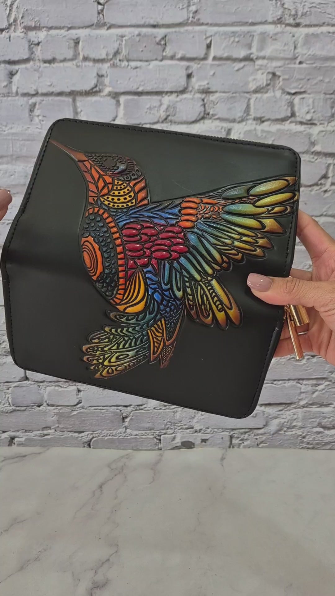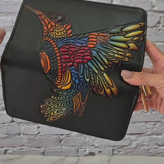BiIletera artesanal negra de dos cierres con colibrí colorido en relieve