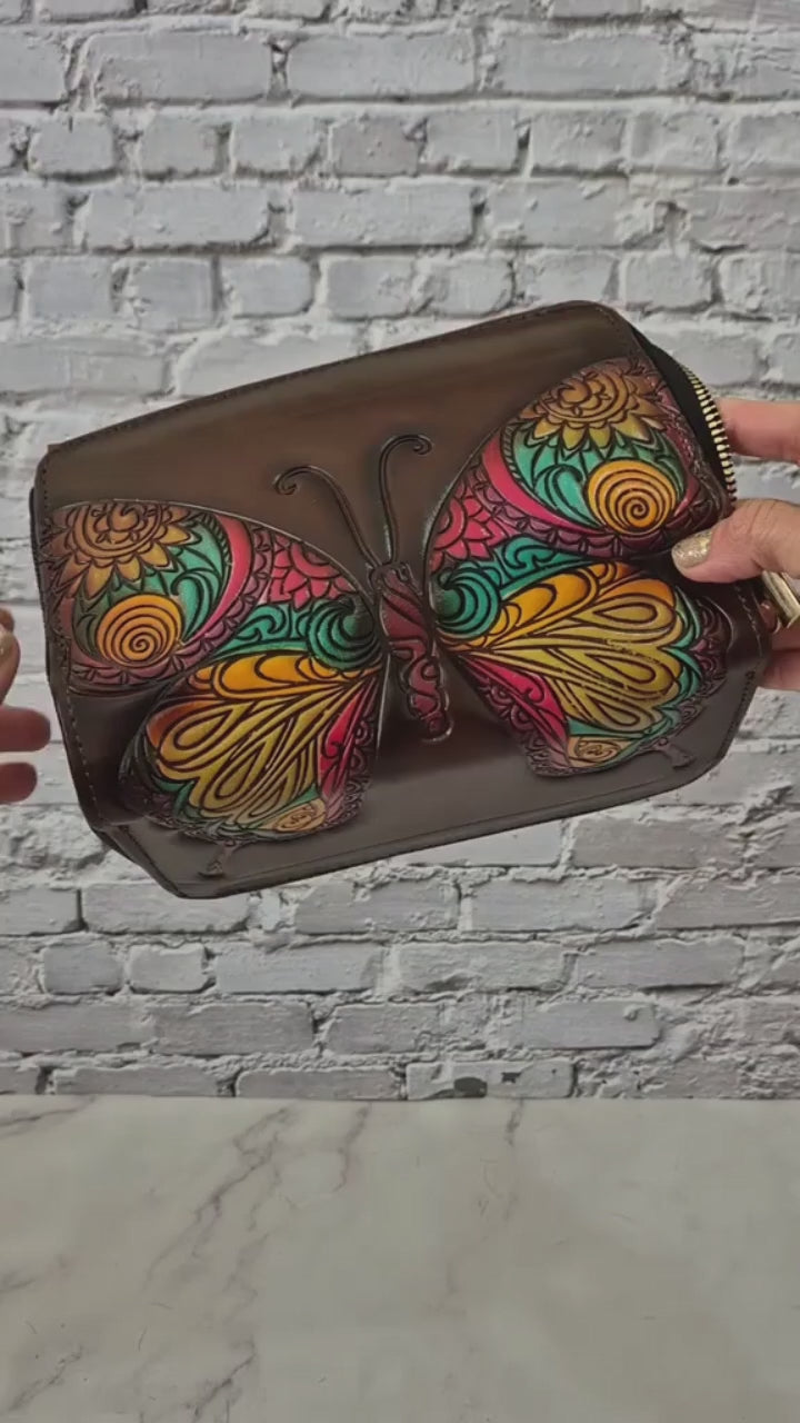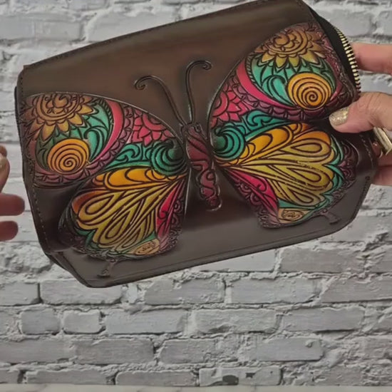 Billetera artesanal con un hermoso diseño de mariposa tallada y pintada a mano, llena de colores vibrantes que simbolizan transformación y libertad. Cada pieza es única, elaborada con esmero por artesanos que combinan tradición y creatividad.