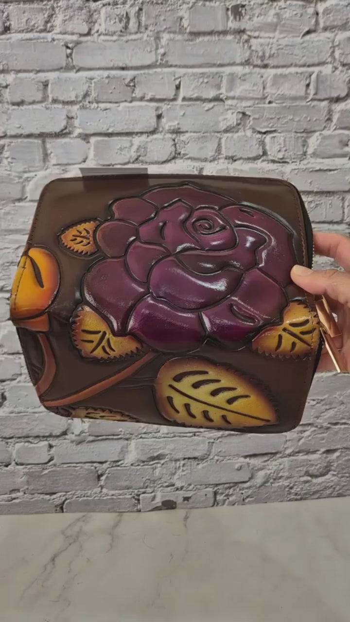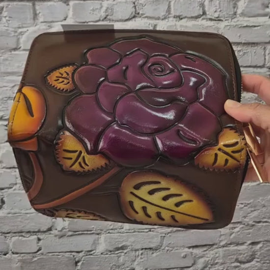 Billetera artesanal con diseño de rosa morada – elegancia y tradición en cada detalle