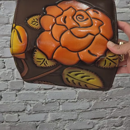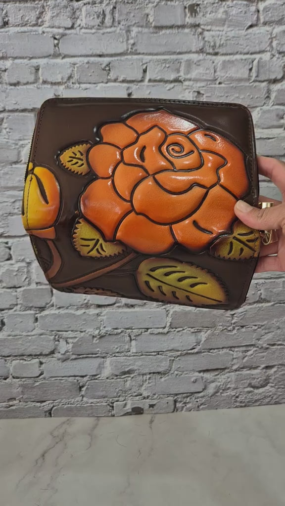 Billetera artesanal con un diseño en relieve de rosa naranja, tallada y pintada a mano con colores cálidos que transmiten energía y alegría. Cada pieza es única, elaborada con dedicación por artesanos que combinan tradición y creatividad.