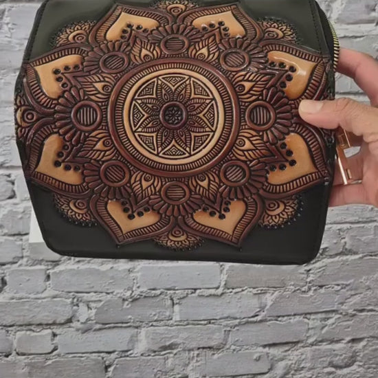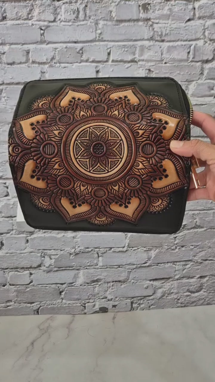Billetera artesanal con un hermoso mandala tallado y pintado a mano en tonos cálidos tierra, símbolo de equilibrio y energía positiva. Cada pieza es única, elaborada con dedicación y detalle.