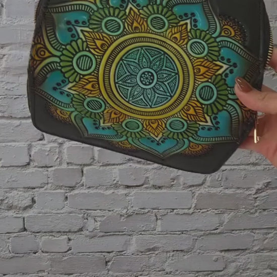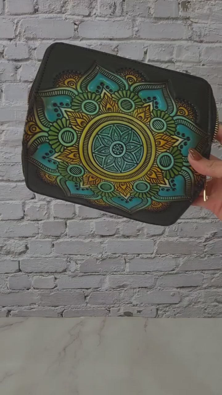 Billetera artesanal decorada con un hermoso mandala tallado y pintado a mano, símbolo de armonía y energía positiva. Su diseño vibrante y detallado la convierte en un accesorio único y lleno de personalidad.