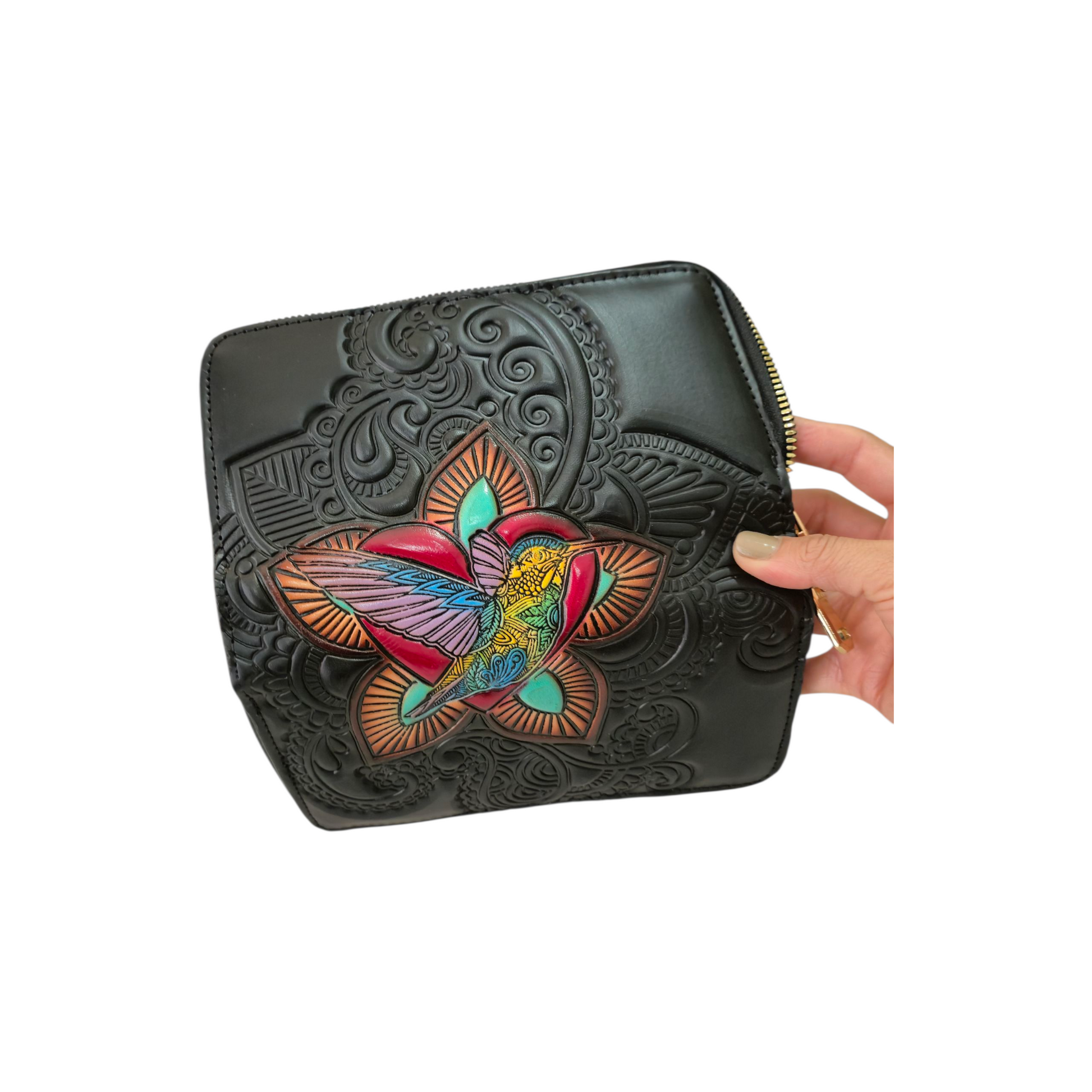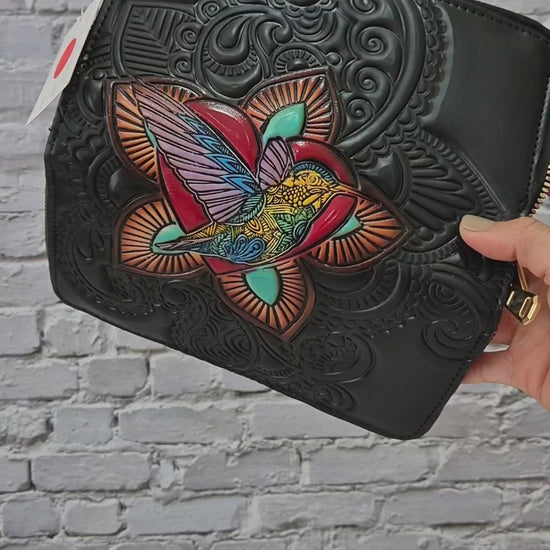 Billetera artesanal de piel con colibrí grabado y pintado a mano