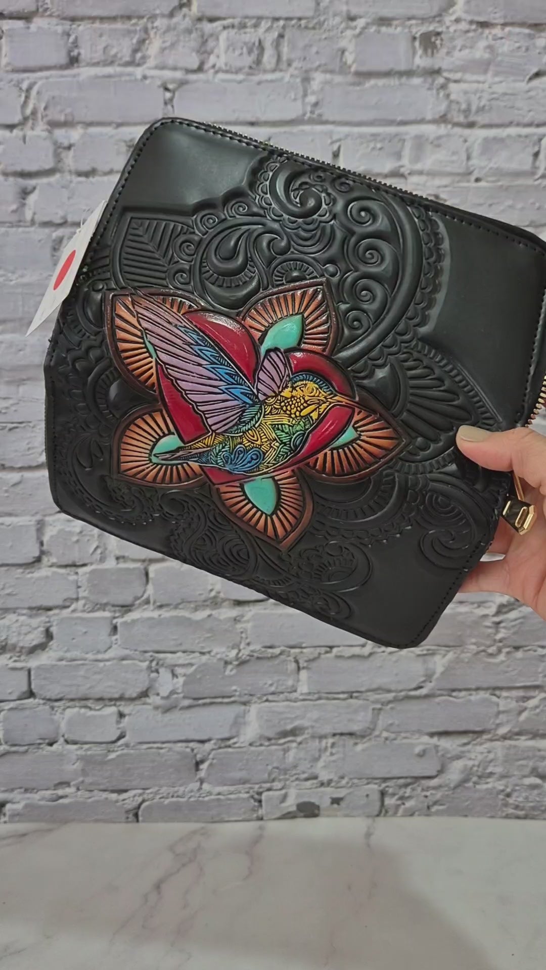 Esta billetera artesanal es una pieza única hecha en piel genuina, con un diseño grabado a mano y un hermoso colibrí pintado en vivos colores.