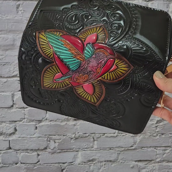 Billetera artesanal de piel con colibrí multicolor grabado y pintado a mano