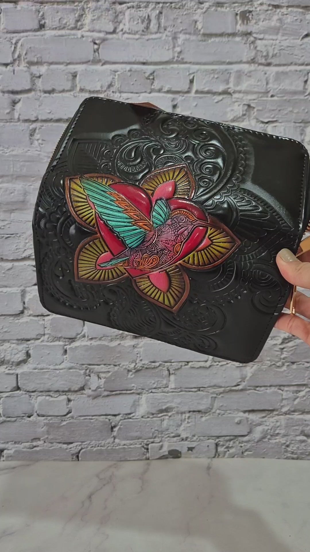 Esta billetera artesanal es una pieza única hecha en piel genuina, con un diseño grabado a mano y un hermoso colibrí pintado en vivos colores.