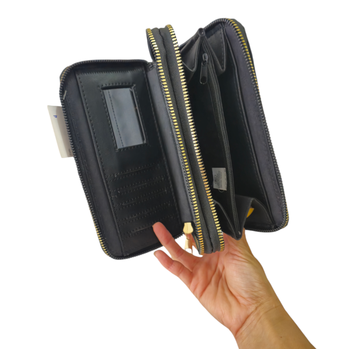 Dos compartimentos amplios para organizar billetes, monedas y tarjetas.
