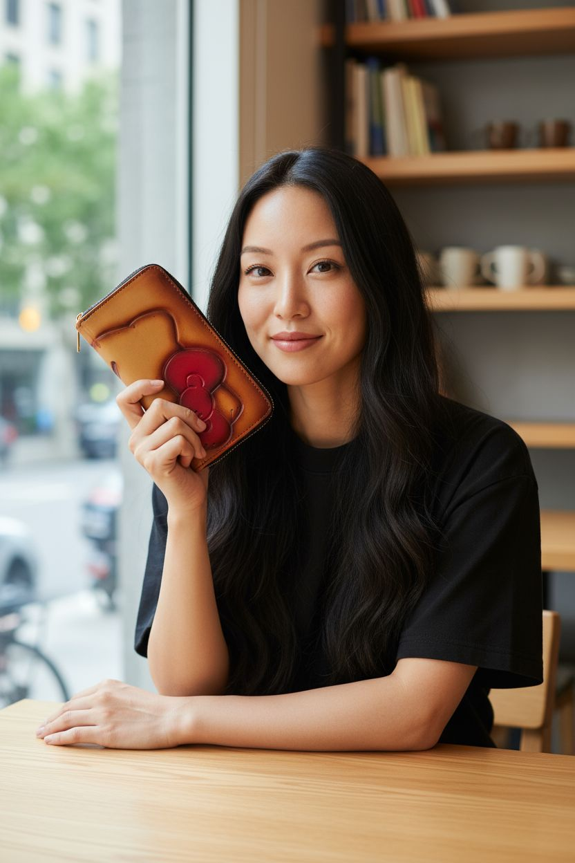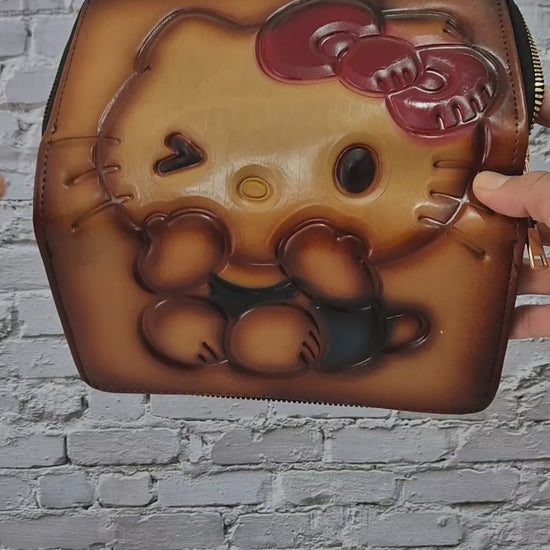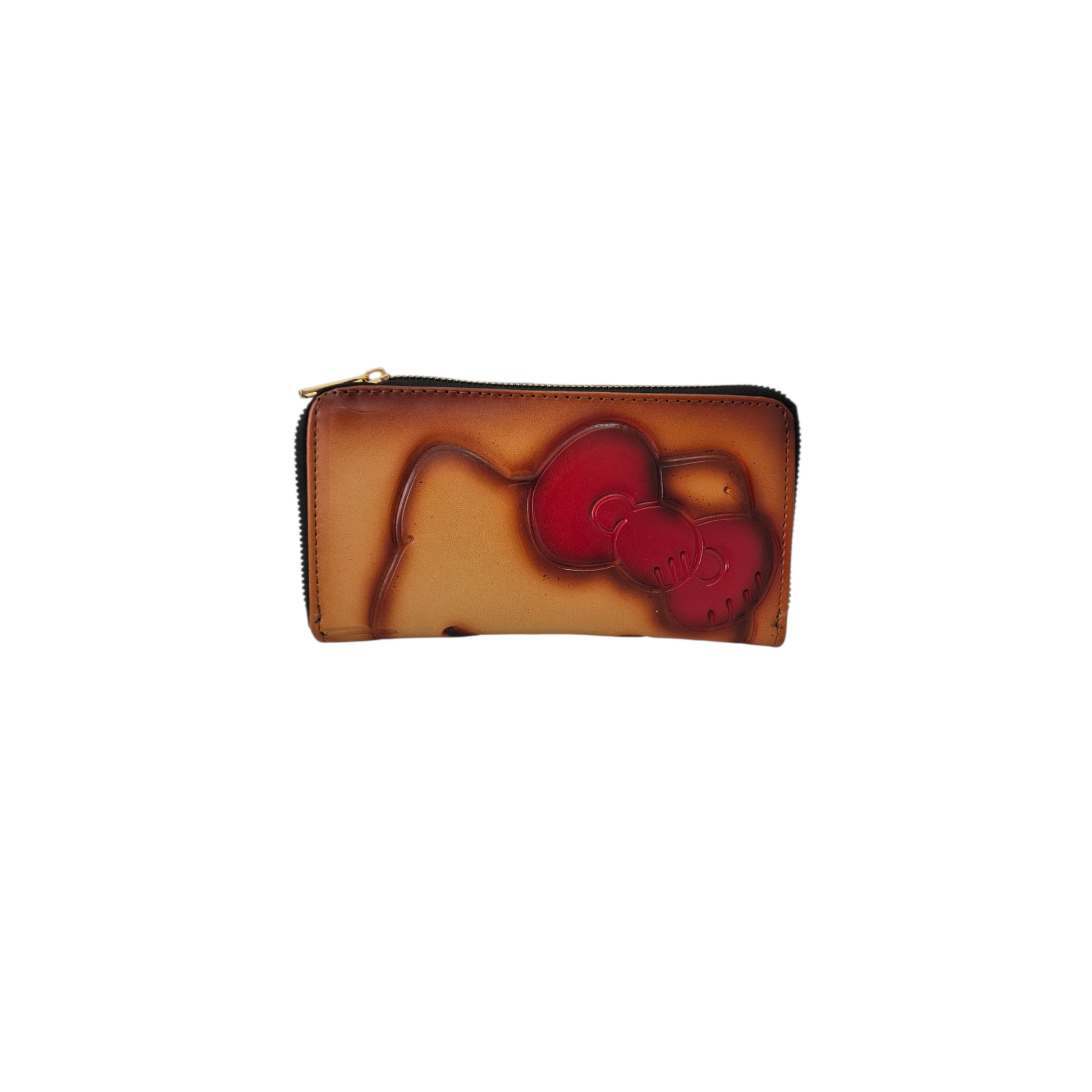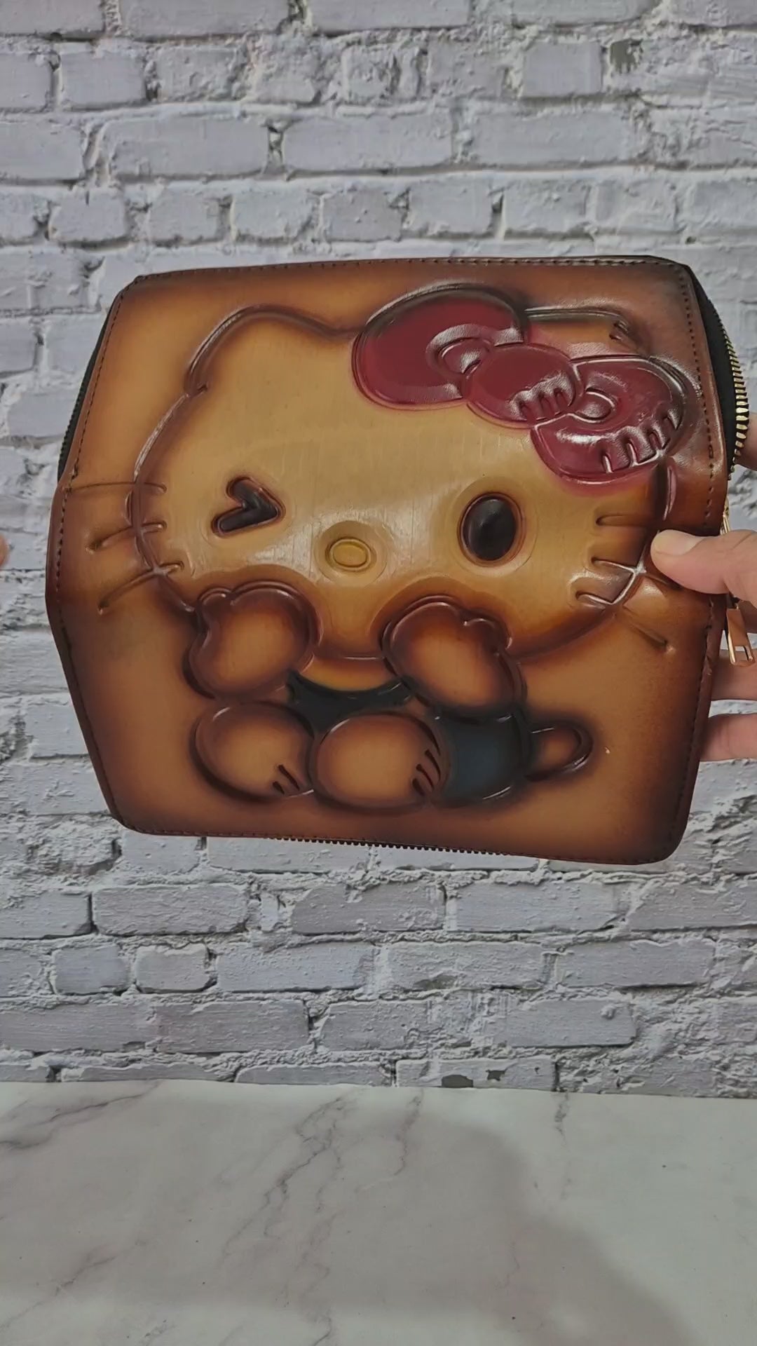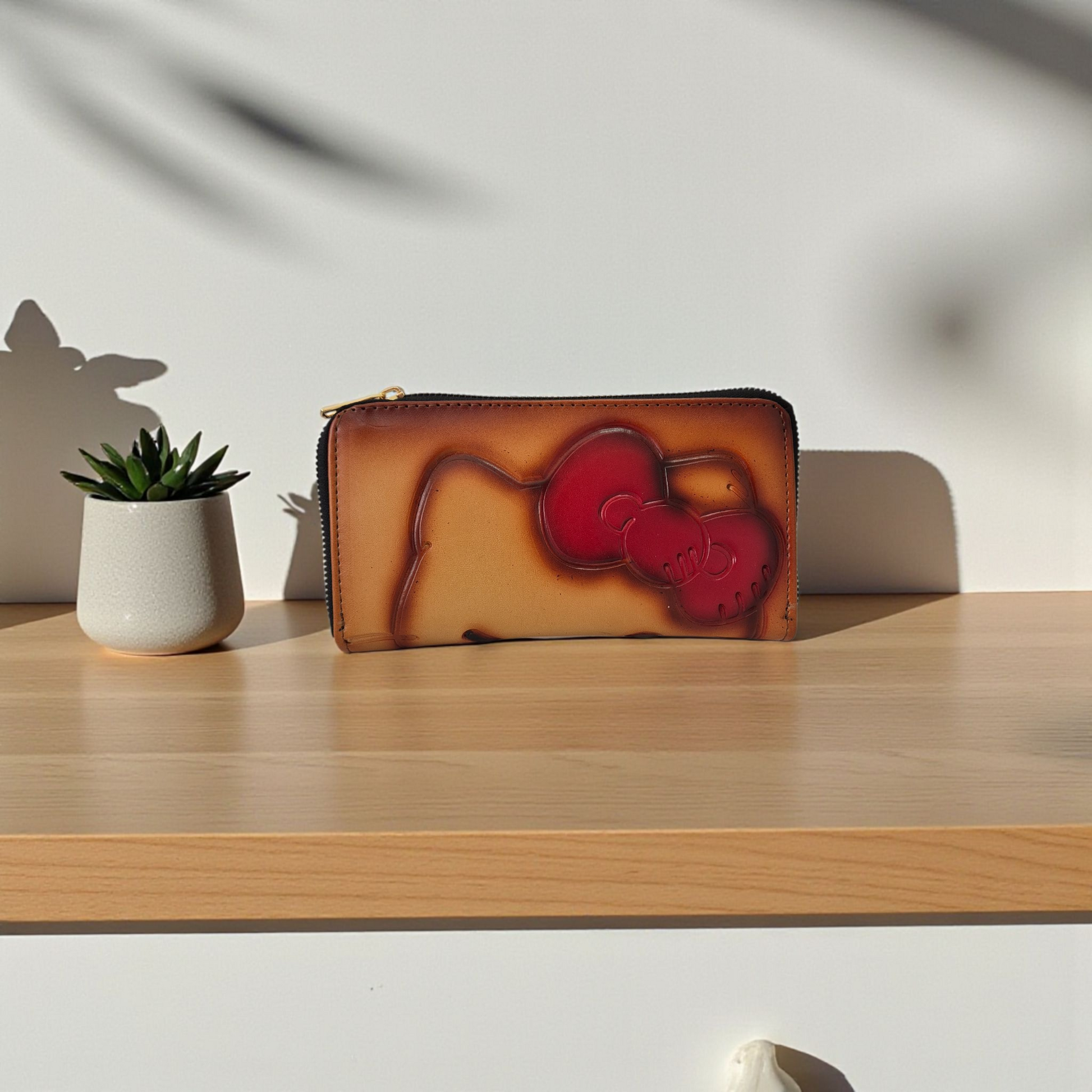 Agrega un toque único a tu estilo con esta billetera artesanal hecha a mano en piel. Su diseño grabado y pintado a detalle resalta un personaje adorable que transmite ternura y alegría.