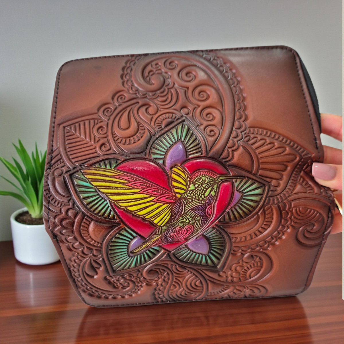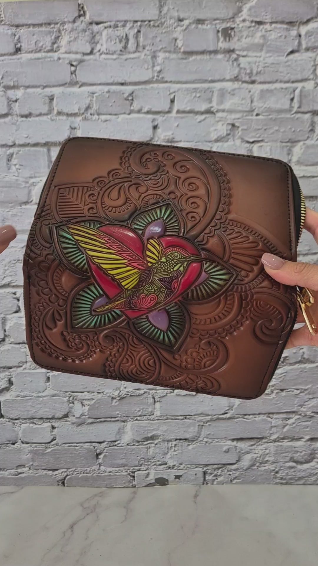 Billetera con diseño grabado de colibrí y corazón, una pieza llena de arte, color y simbolismo. Su relieve detallado y tonos vibrantes la hacen destacar como un accesorio único que combina elegancia y funcionalidad.