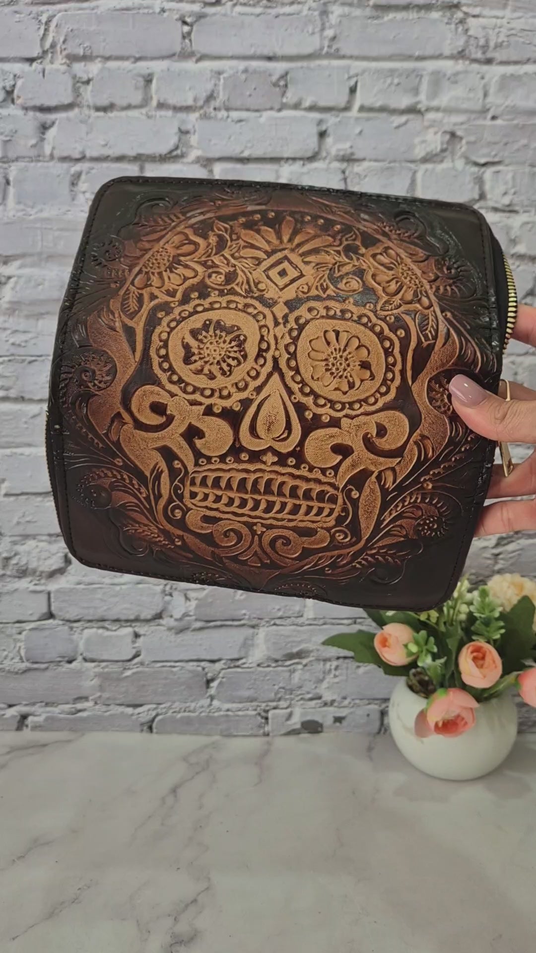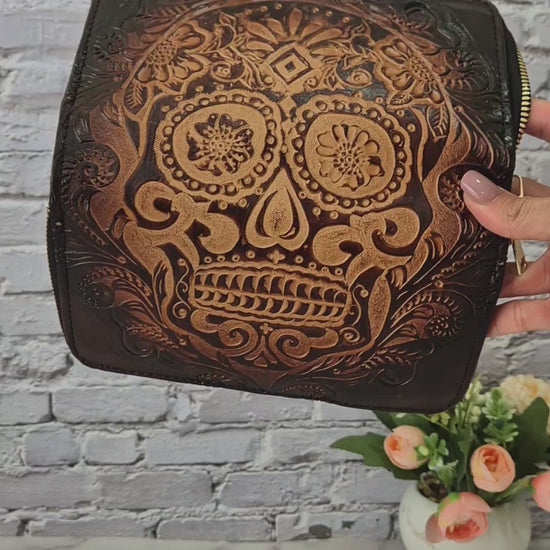 Descubre esta billetera artesanal única, elaborada con detalles grabados en cuero que representan una calavera tradicional mexicana. Su diseño combina arte y funcionalidad, ideal para quienes aman los accesorios con estilo y personalidad.