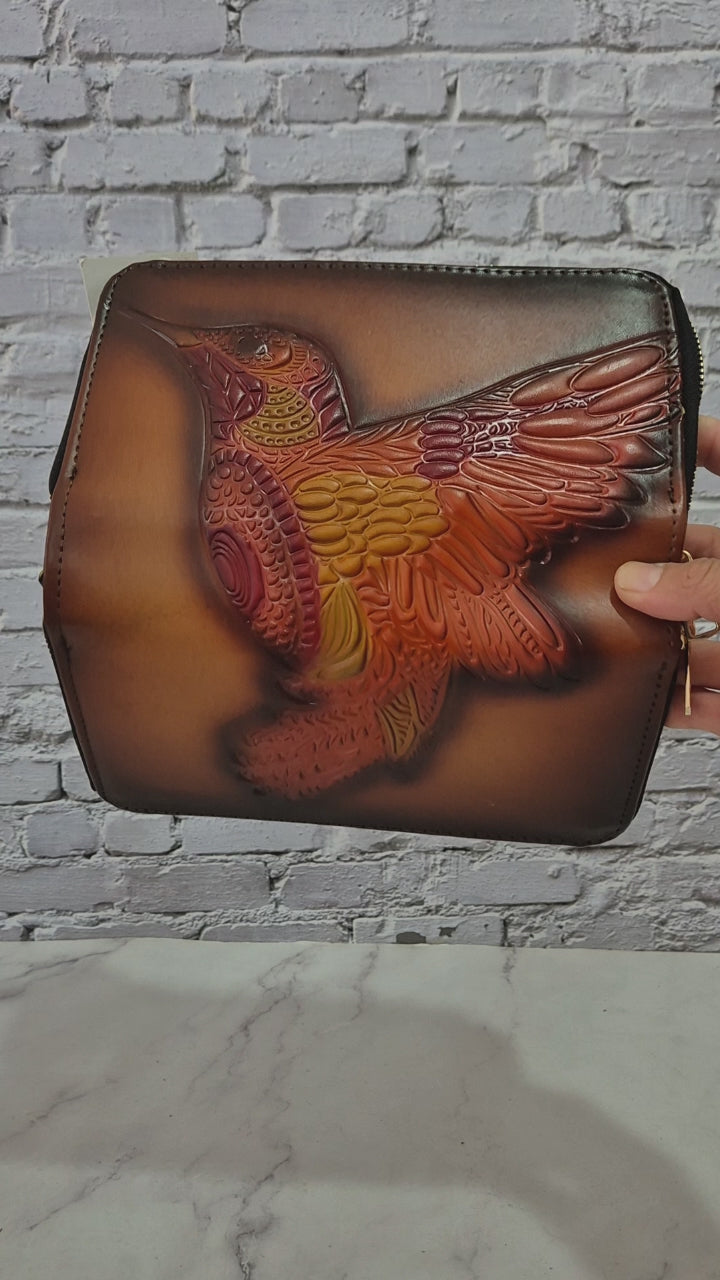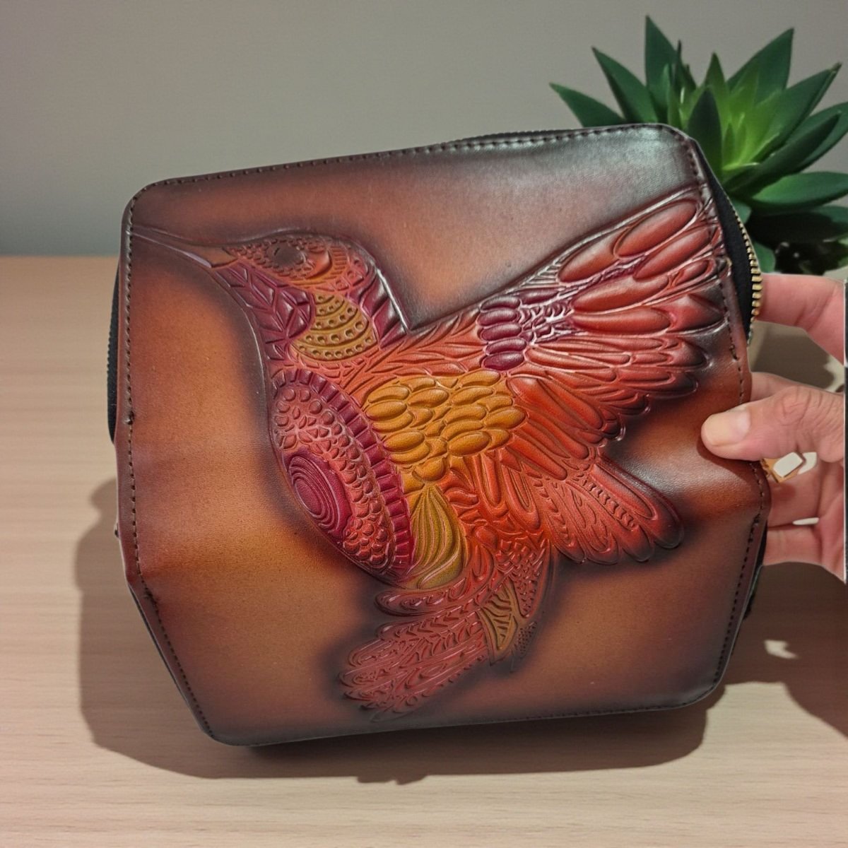 Billetera con hermoso diseño grabado de colibrí, inspirada en la naturaleza y el arte tradicional. Su relieve colorido y detallado la convierte en una pieza única que combina belleza, funcionalidad y estilo.