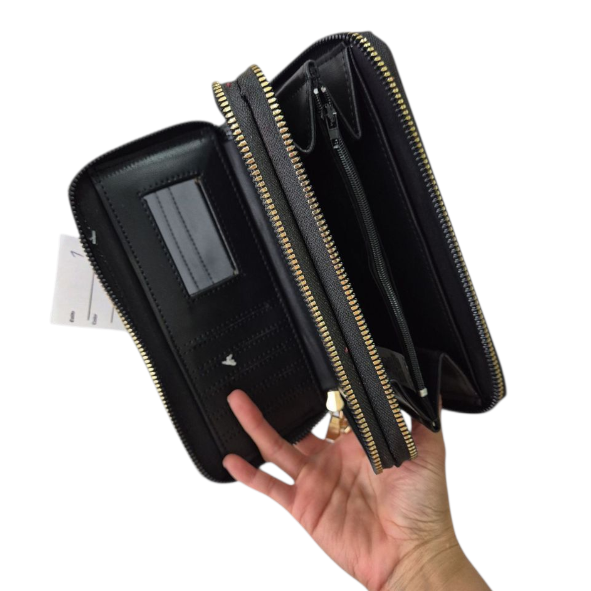 Cuenta con dos compartimentos con cierre, 12 espacios para tarjetas, 4 compartimentos para billetes, bolsillo para monedas con cierre y espejo interior.