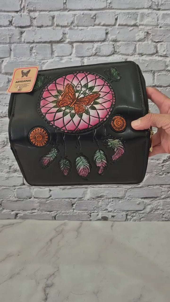 Billetera artesanal decorada con un hermoso atrapasueños y mariposa tallados y pintados a mano, símbolo de protección, libertad y buenas energías. Su combinación de tonos cálidos y detalles únicos la convierte en una pieza llena de significado y estilo.