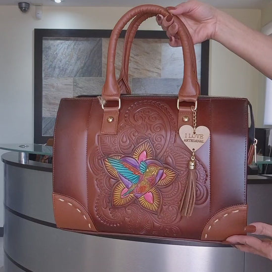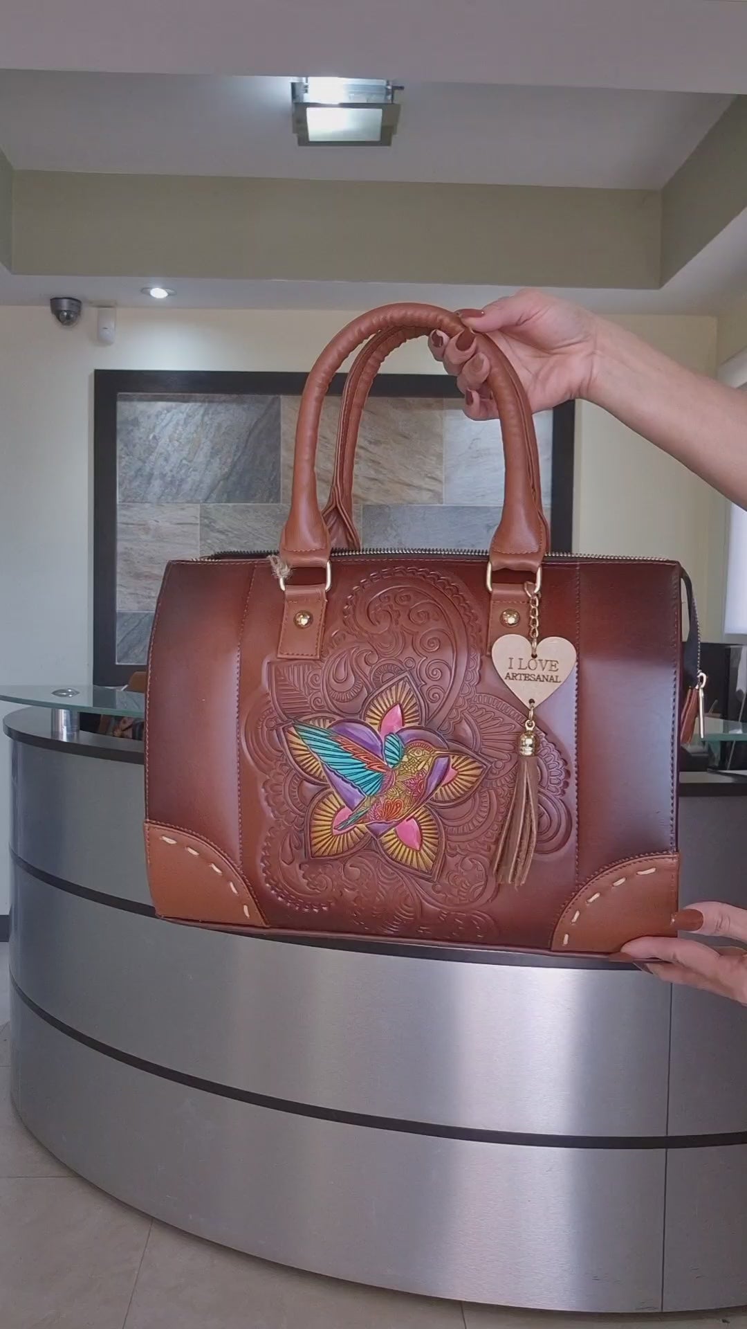 Agrega un toque único y lleno de color a tu estilo con esta bolsa artesanal en tono café, elaborada con un detallado grabado y un hermoso colibrí pintado a mano. Su diseño combina elegancia, tradición y un acabado vibrante que la hace destacar en cualquier outfit.