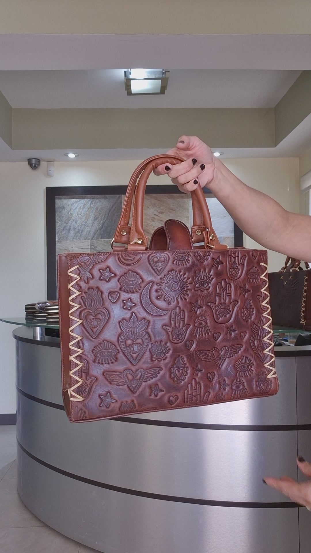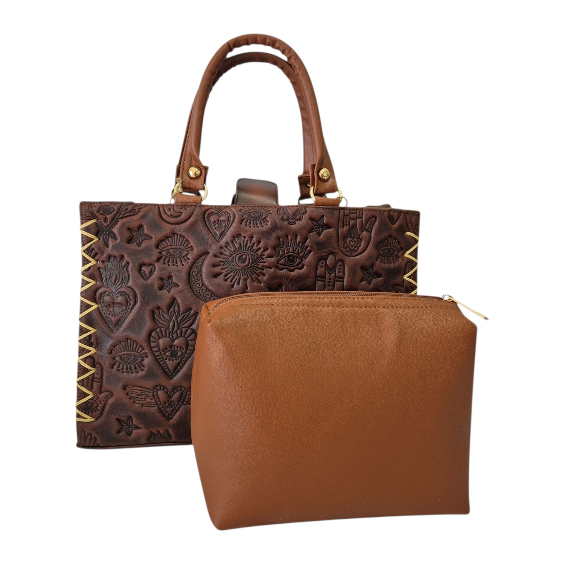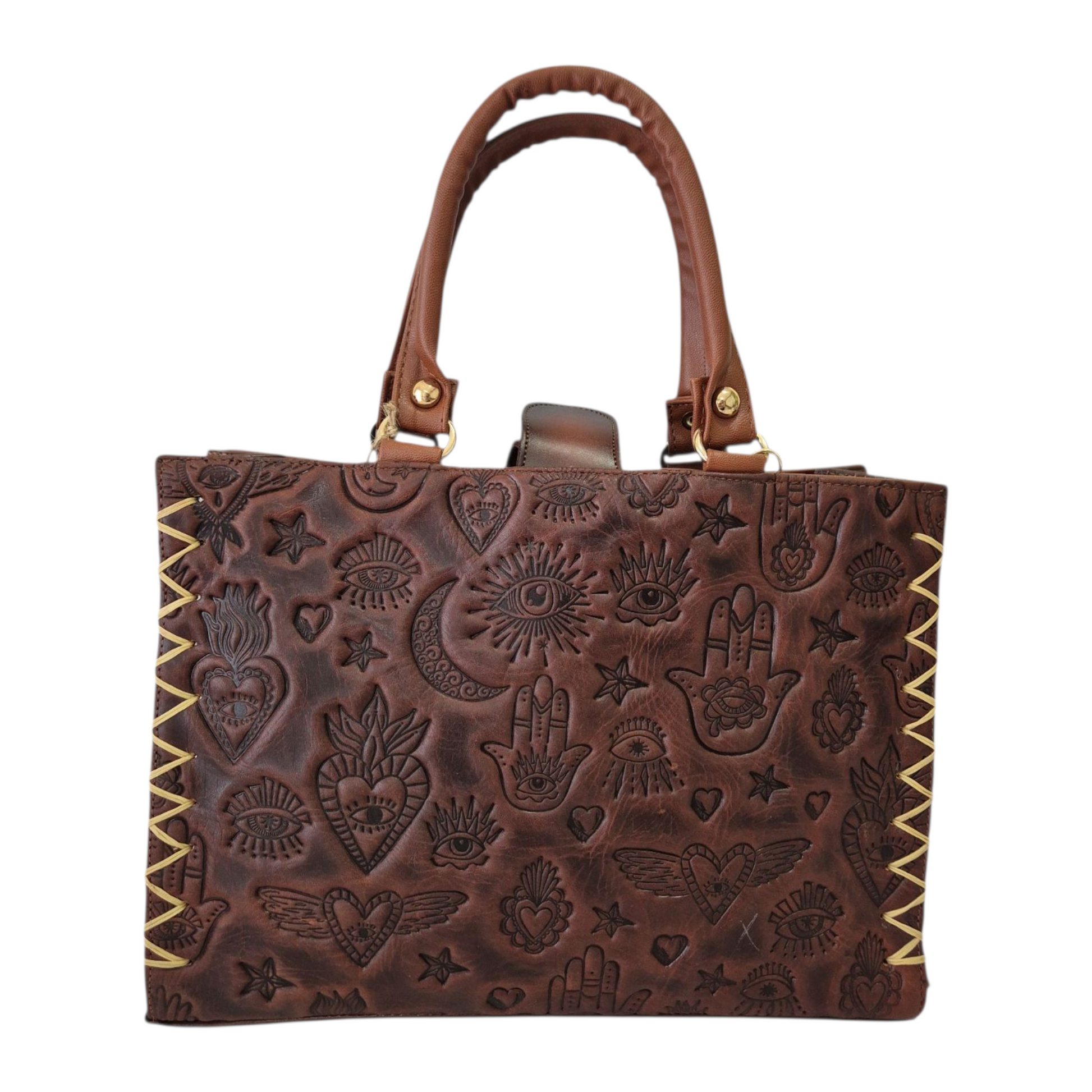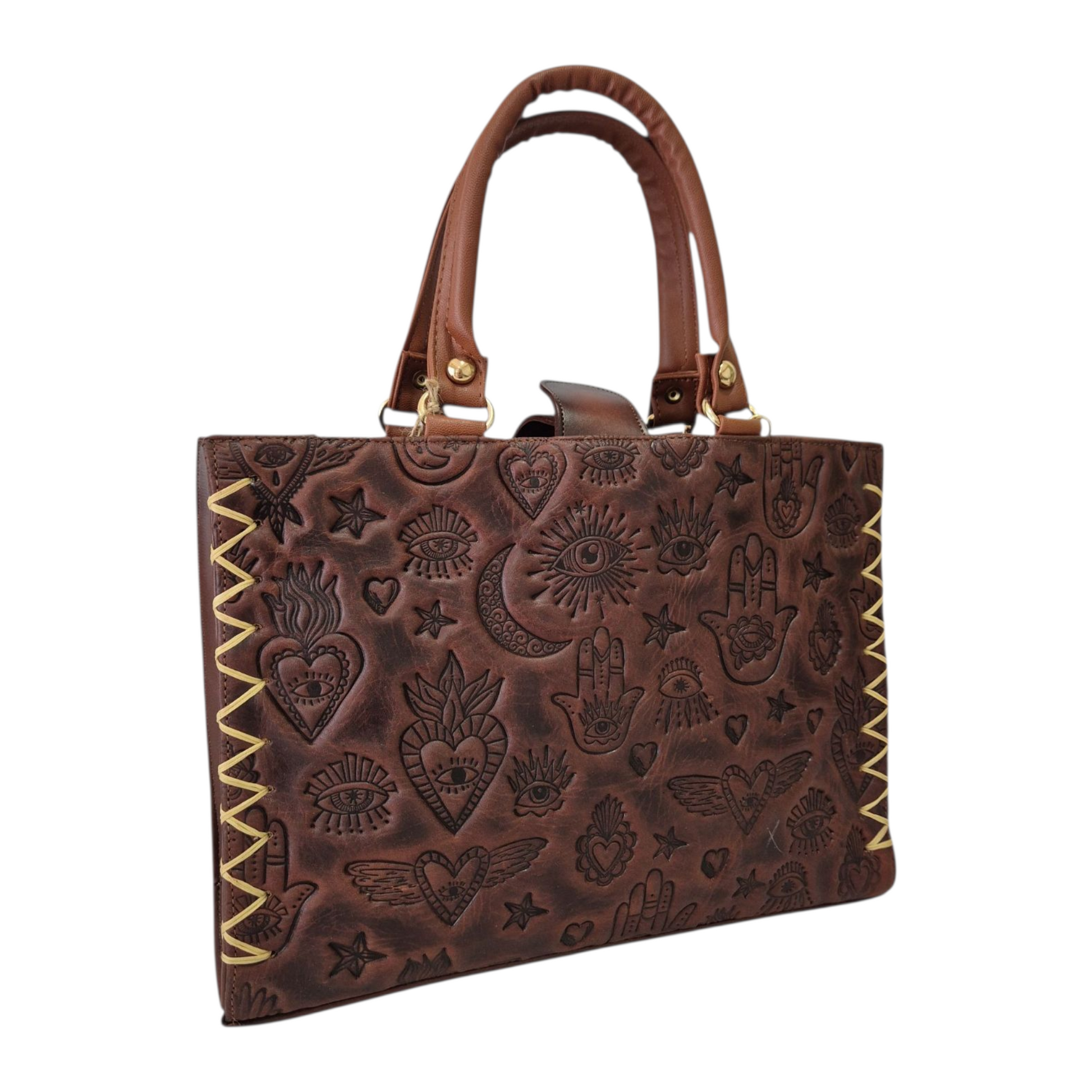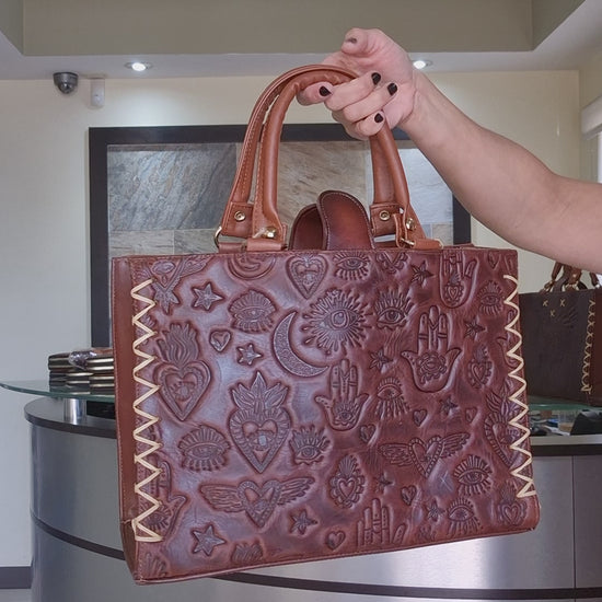 Dale un toque de estilo único a tu look con esta hermosa bolsa artesanal, diseñada con grabados inspirados en símbolos místicos, corazones alados y ojos protectores que evocan energía, amor y buena vibra. Cada relieve refleja un trabajo detallado que combina arte, elegancia y un aire bohemio lleno de personalidad.