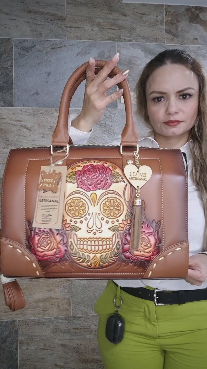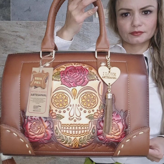 Bolsa artesanal color café con diseño de calavera y flores grabadas a mano estilo mexicano