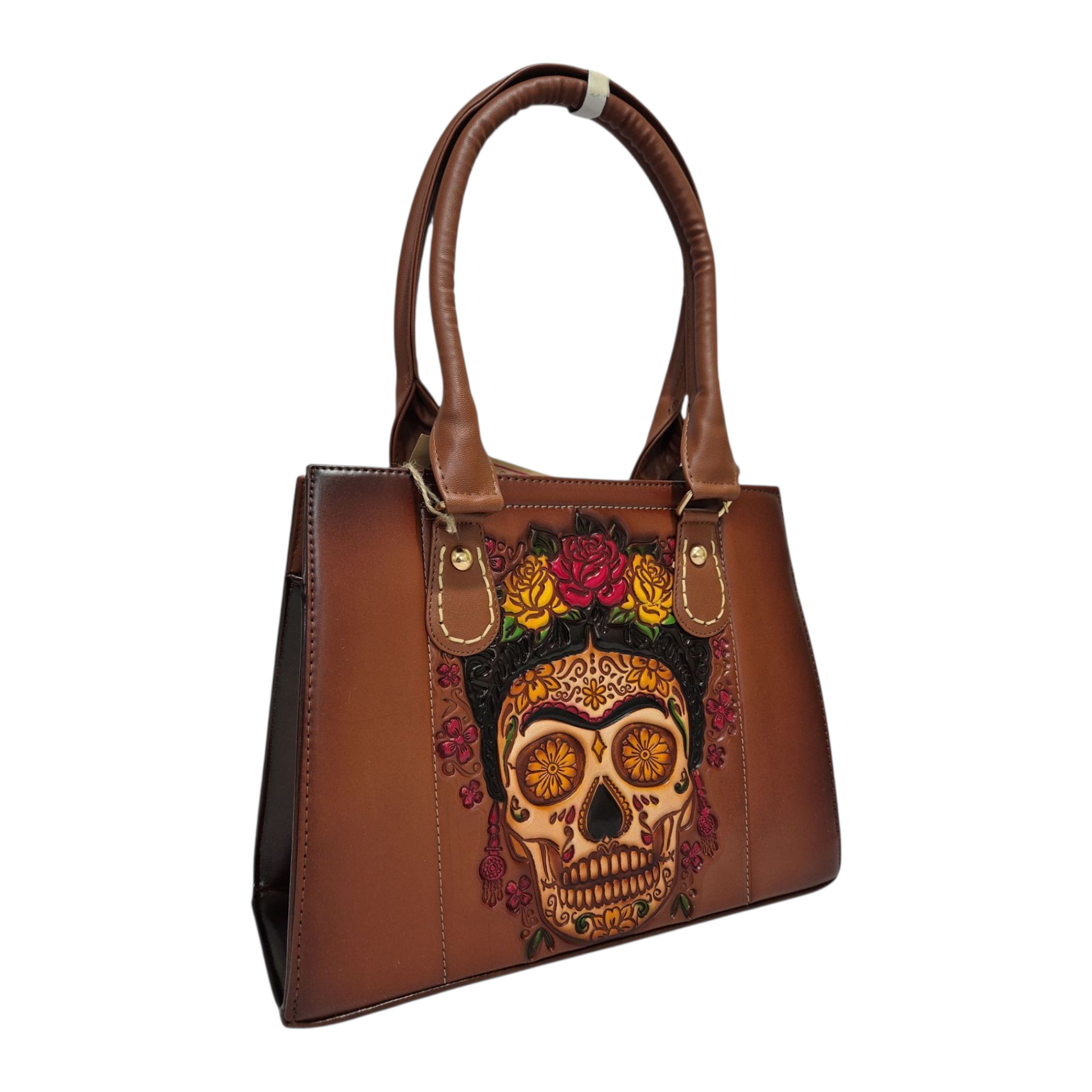 Bolsa artesanal grabada con diseño de calavera floral | Estilo mexicano color café