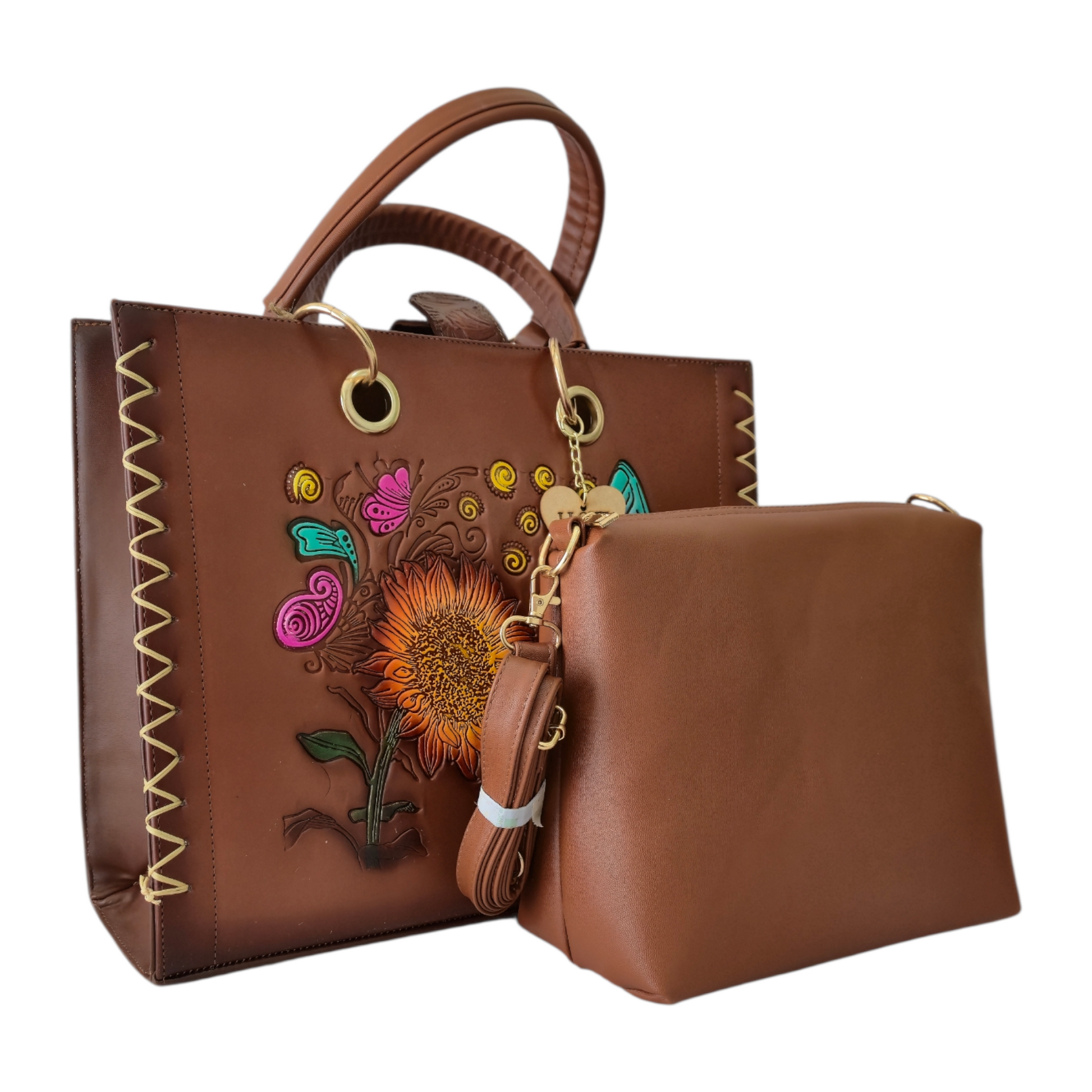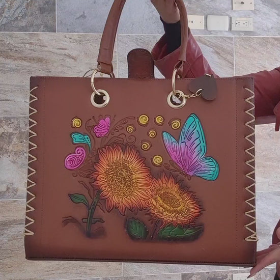 Bolsa Artesanal Grabada con Girasoles y Mariposa – Diseño Colorido y Detallado