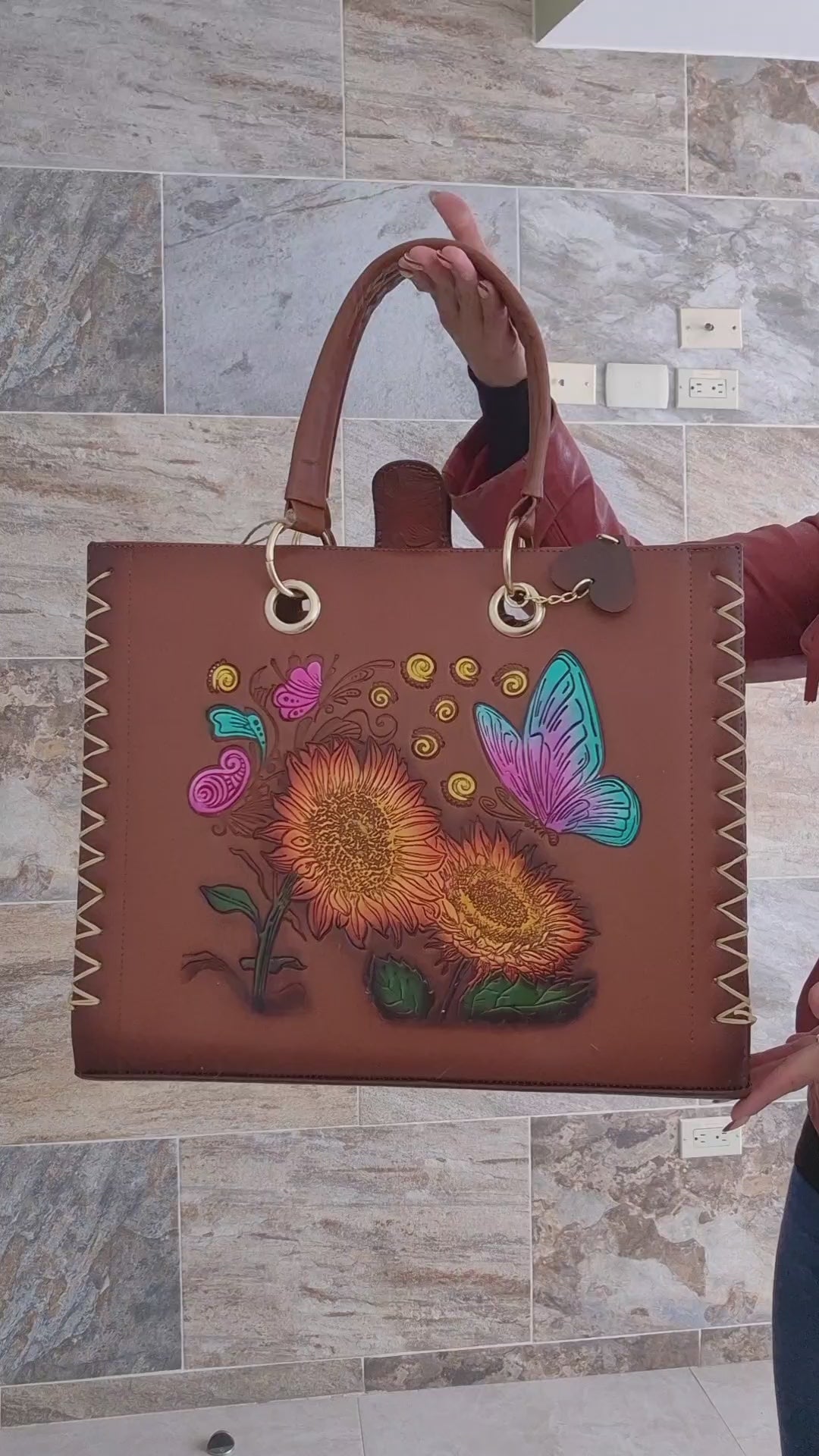 Lleva contigo una pieza única con esta hermosa bolsa artesanal decorada con un grabado de girasoles y una mariposa en tonos vibrantes. Cada detalle está trabajado con dedicación, creando un diseño lleno de vida que destaca por su estilo colorido y femenino.