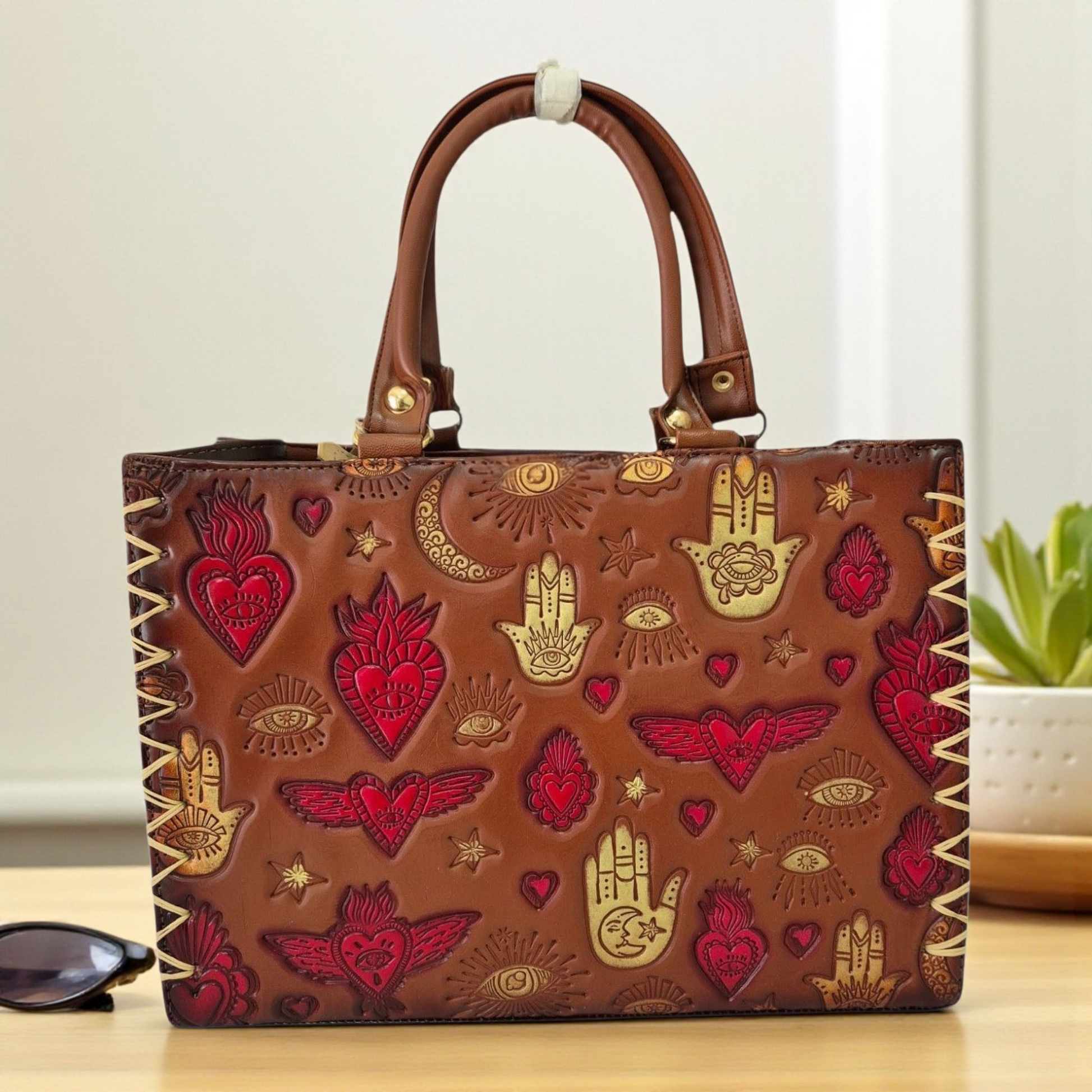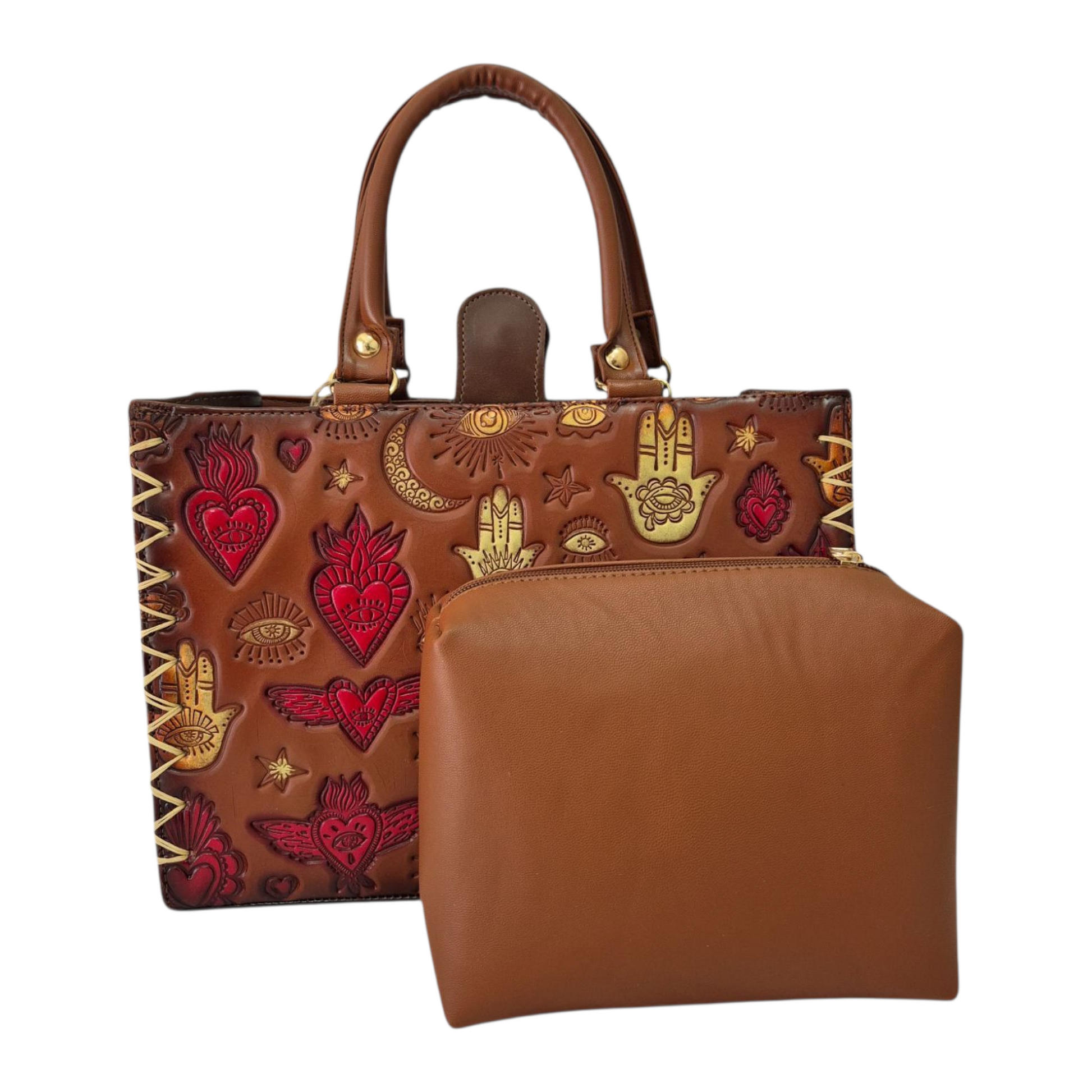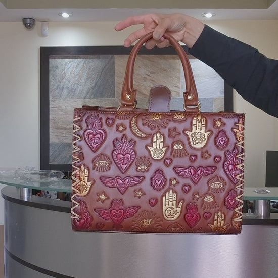 Bolsa artesanal elaborada con detalles únicos inspirados en la protección y la buena energía. Su diseño incluye la Mano de Fátima, corazones alados, ojos y lunas grabadas y pintadas a mano en tonos dorados y rojos sobre cuero color miel. Perfecta para quienes aman lo espiritual, lo bohemio y lo hecho con alma.