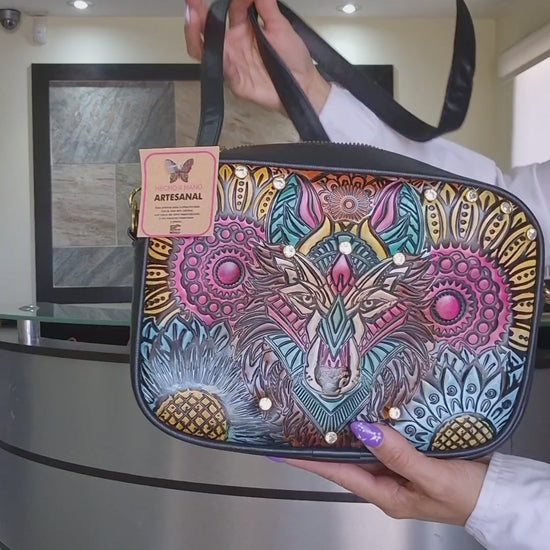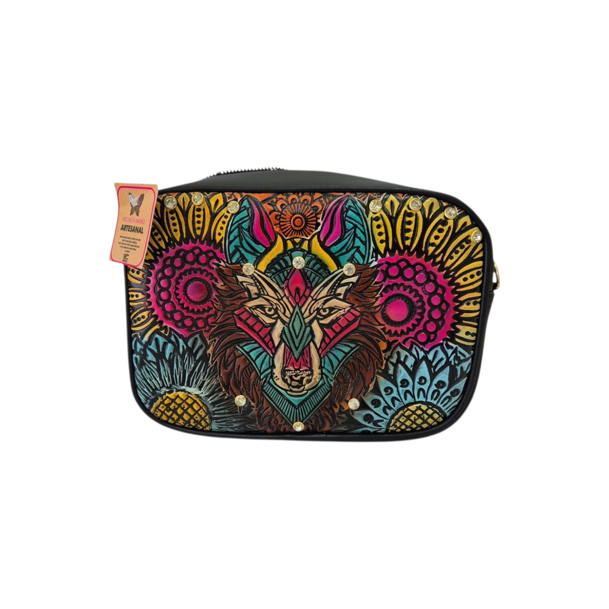 Bolsa Crossbody Artesanal con Diseño Colorido de Lobo y Detalles Dorados