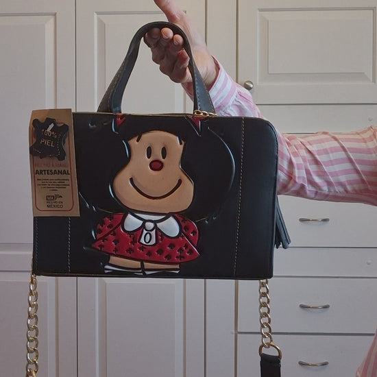 Bolsa crossbody artesanal grabada con iconico personaje alegre