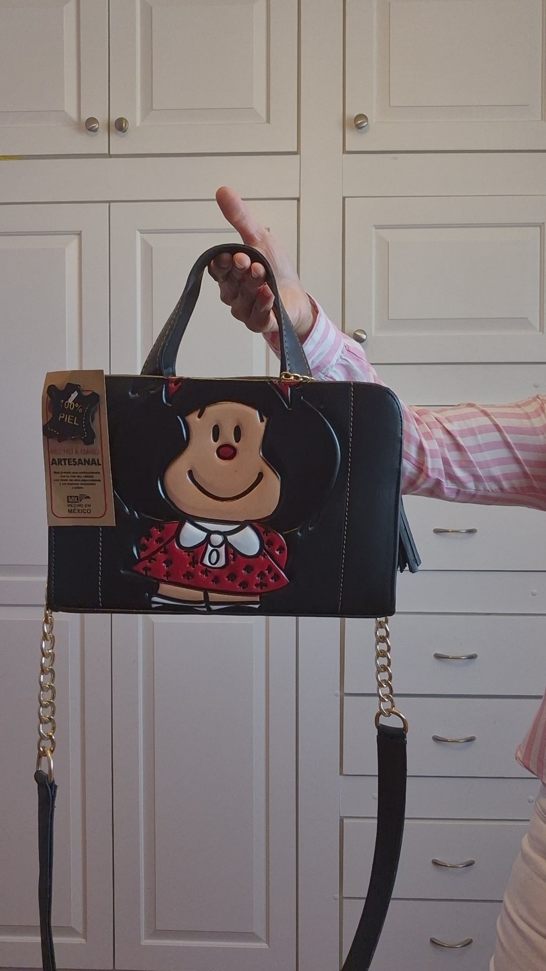 Cuenta con asa corta para llevar en mano y cadena dorada para usar al hombro o cruzada, ideal para un look divertido y original.