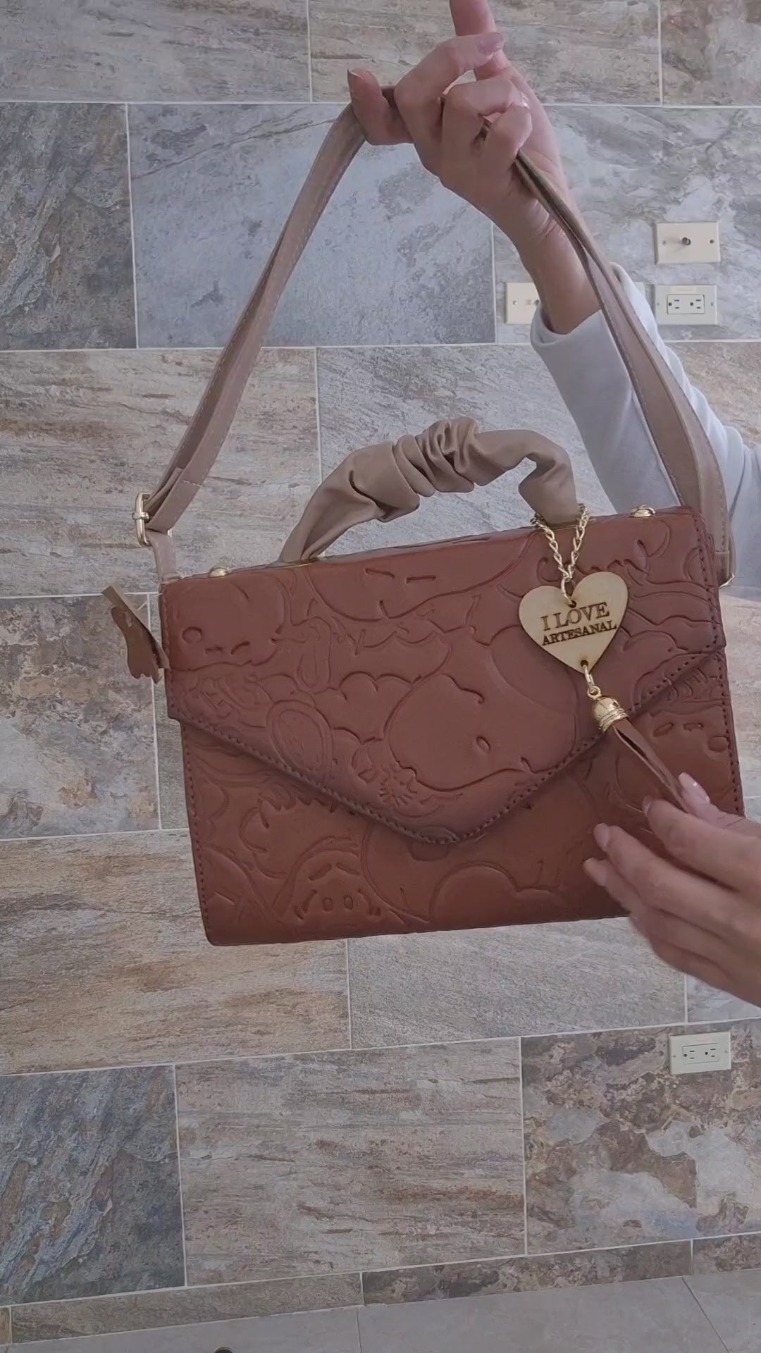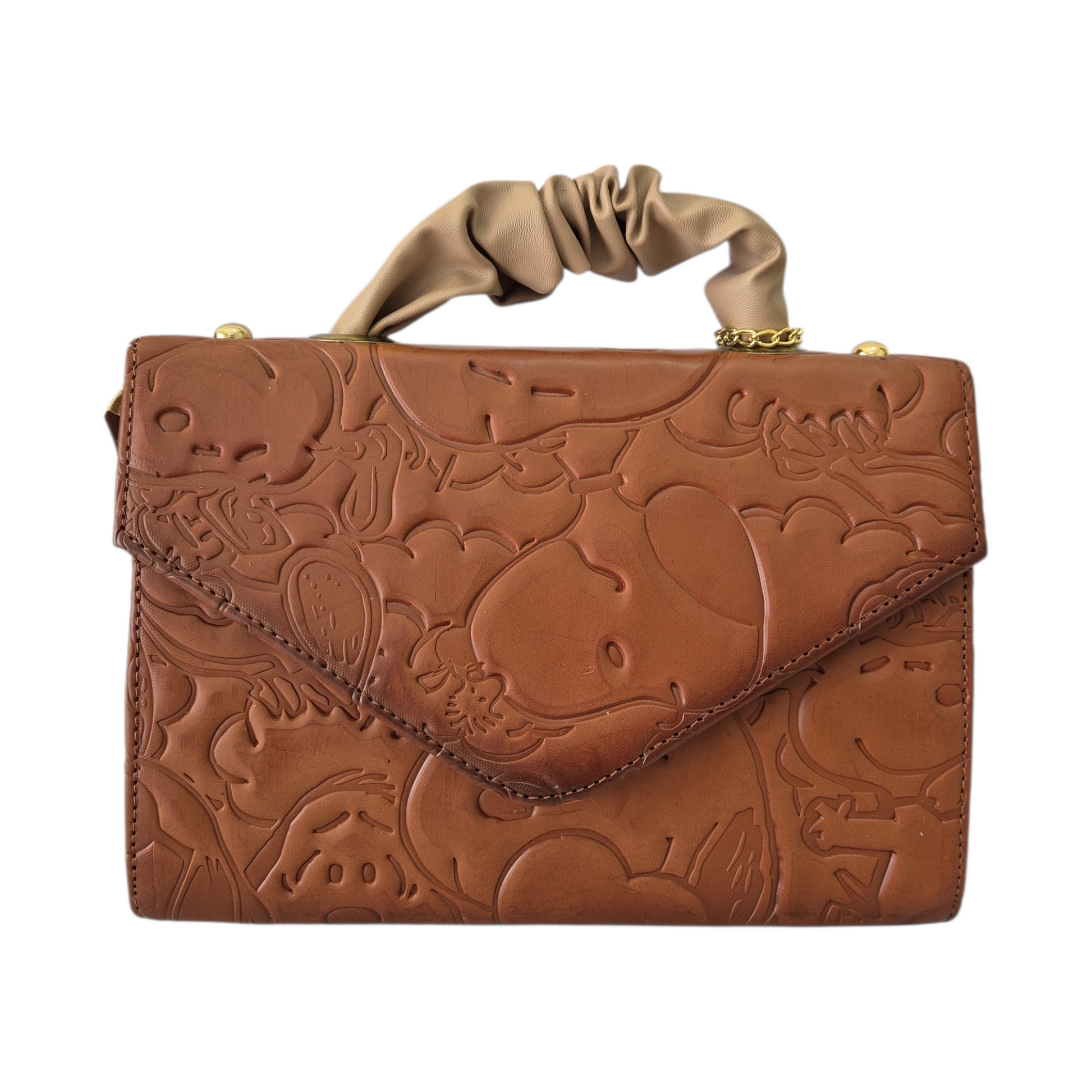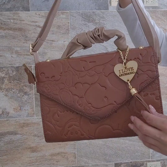 Esta hermosa bolsa crossbody artesanal destaca por su diseño único con grabado de Snoopy, que le da un estilo divertido y original. Su acabado en tono café y su textura grabada la convierten en una pieza especial que combina artesanía y personalidad.