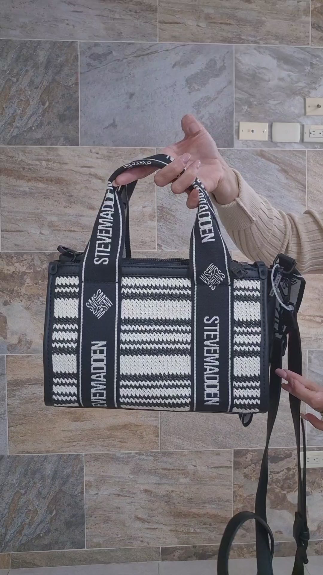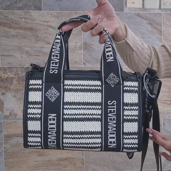 Bolsa Steve Madden crossbody tejida en negro con beige, un diseño moderno y versátil ideal para el uso diario.
