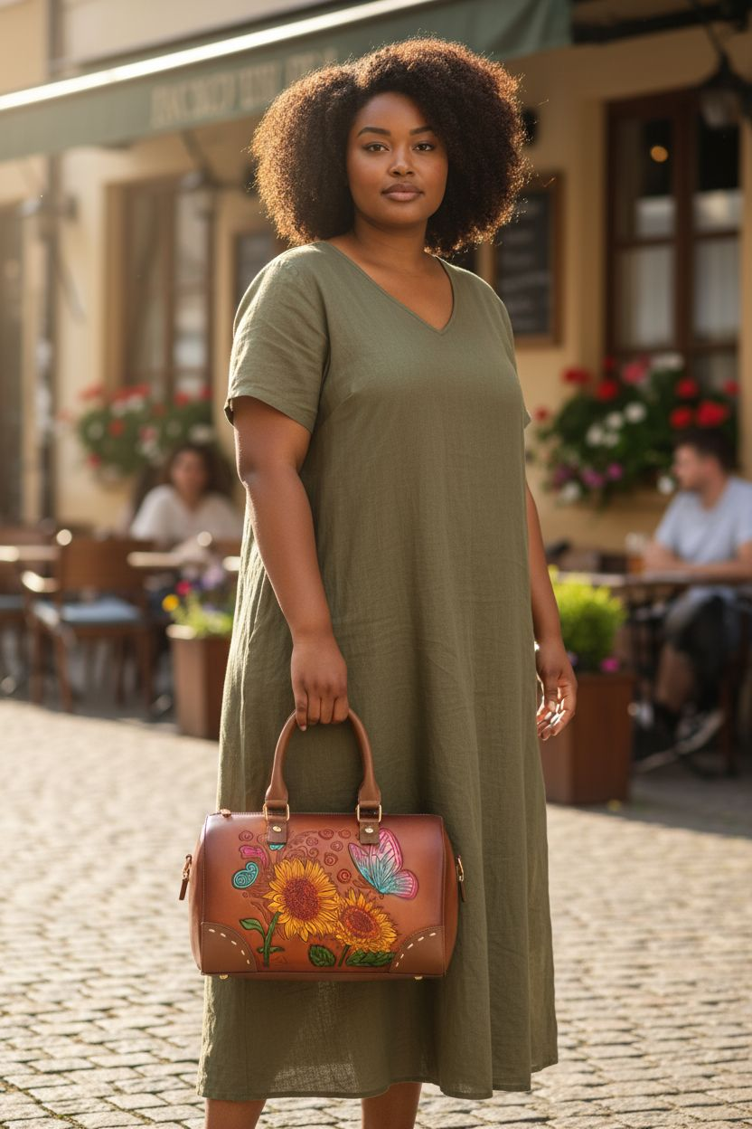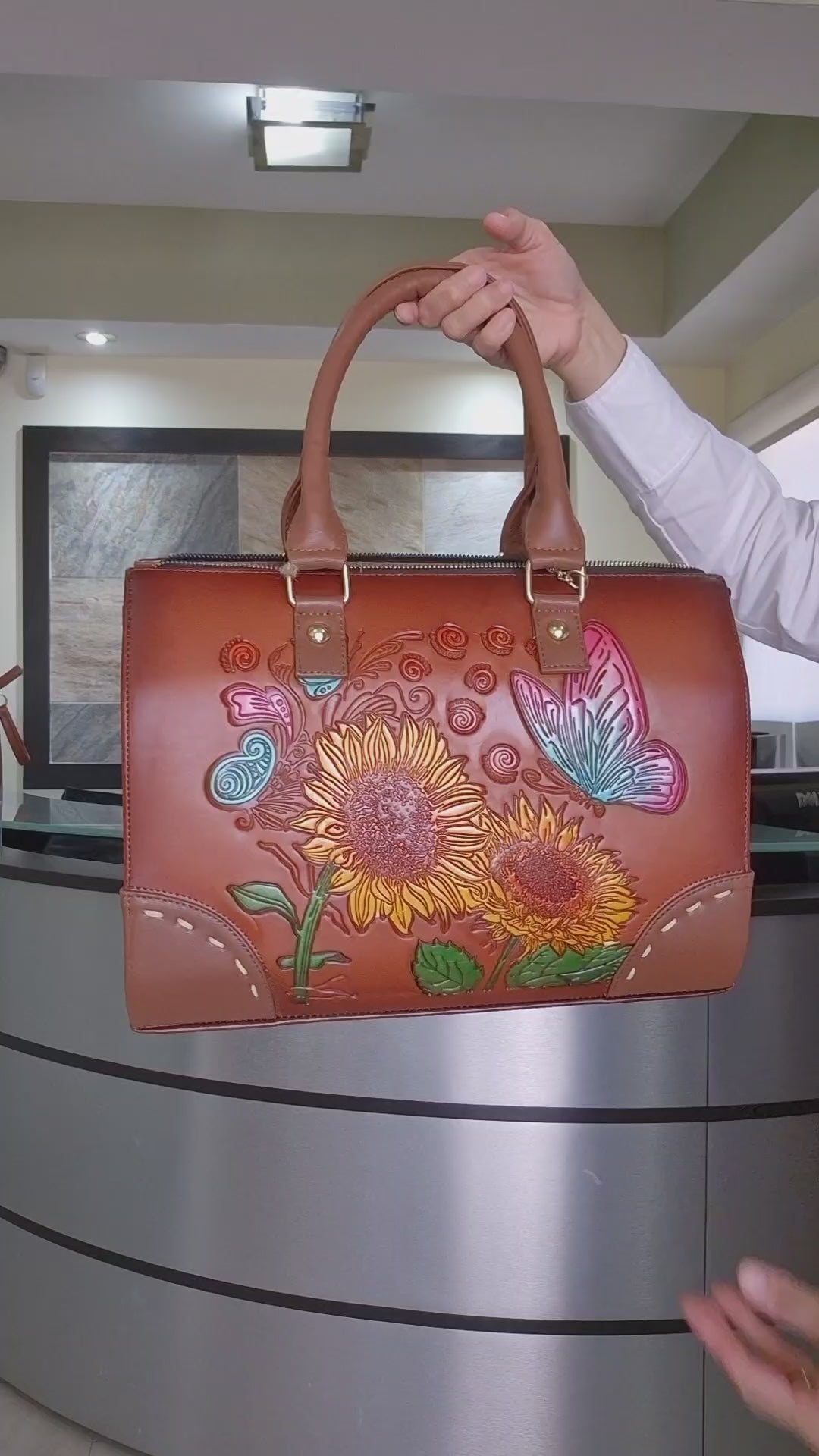 Luce única con esta bolsa de mano artesanal con diseño grabado de girasoles y mariposa en tonos vibrantes. Su acabado negro con detalles en relieve la convierte en una pieza sofisticada y alegre, perfecta para combinar con cualquier outfit.
