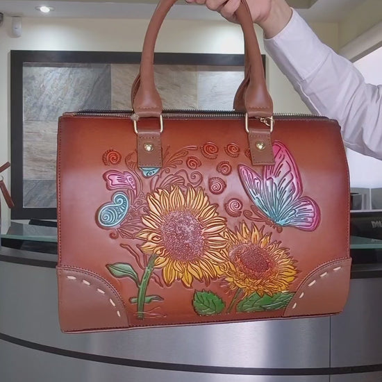 Bolsa de mano café con girasoles y mariposa grabados a color – elegante y artesanal