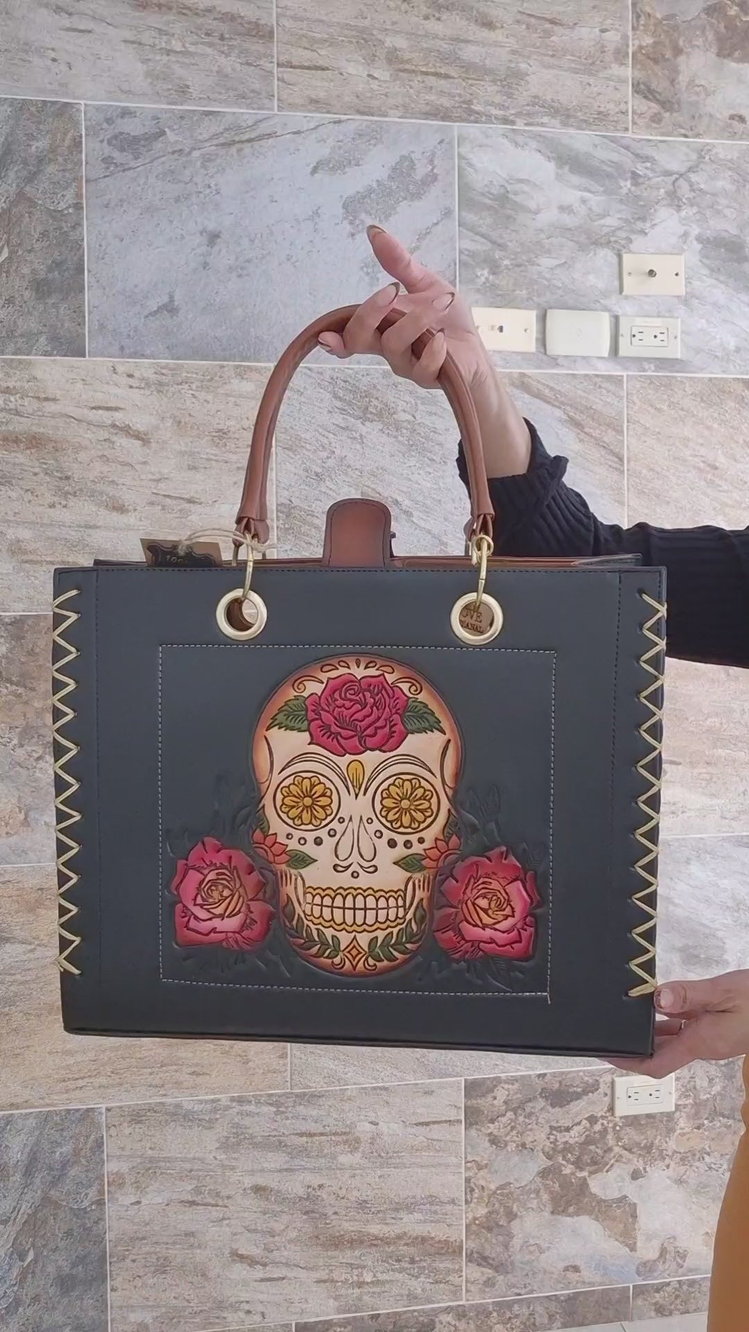 Eleva tu estilo con este set artesanal único, compuesto por una bolsa de mano negra con diseño de calavera floral en relieve y una cosmetiquera color café que también puede usarse como crossbody.