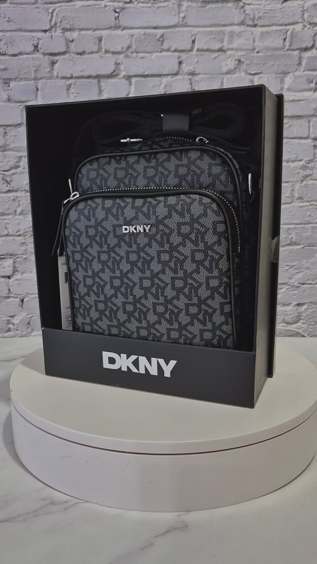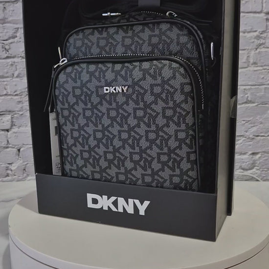 Un diseño moderno y sofisticado que combina practicidad con el estilo icónico de DKNY. Esta crossbody presenta el clásico monograma de la marca en tonos negros y grises, creando un look urbano y elegante perfecto para el día a día.