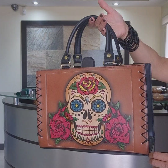 Bolsa de Mano Artesanal Para Mujer con Diseño Calavera Mexicana y Rosas Estilo Día de los Muertos