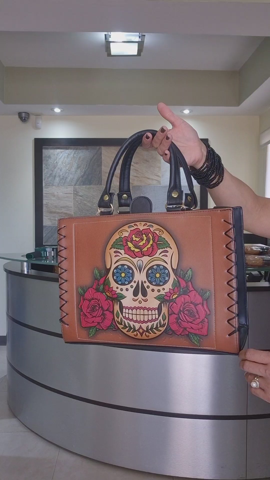 Un bolso que no pasa desapercibido. Su piel en tono marrón cálido se convierte en el lienzo perfecto para una obra de arte inspirada en la tradición mexicana del Día de los Muertos. Al frente, una calavera majestuosa luce ojos convertidos en flores azules, una rosa ardiente coronando su frente y dos rosas rojas enmarcando su sonrisa eterna. Los delicados bordados negros en zigzag en los costados refuerzan su carácter artesanal, mientras las asas negras aportan un contraste elegante y sofisticado.