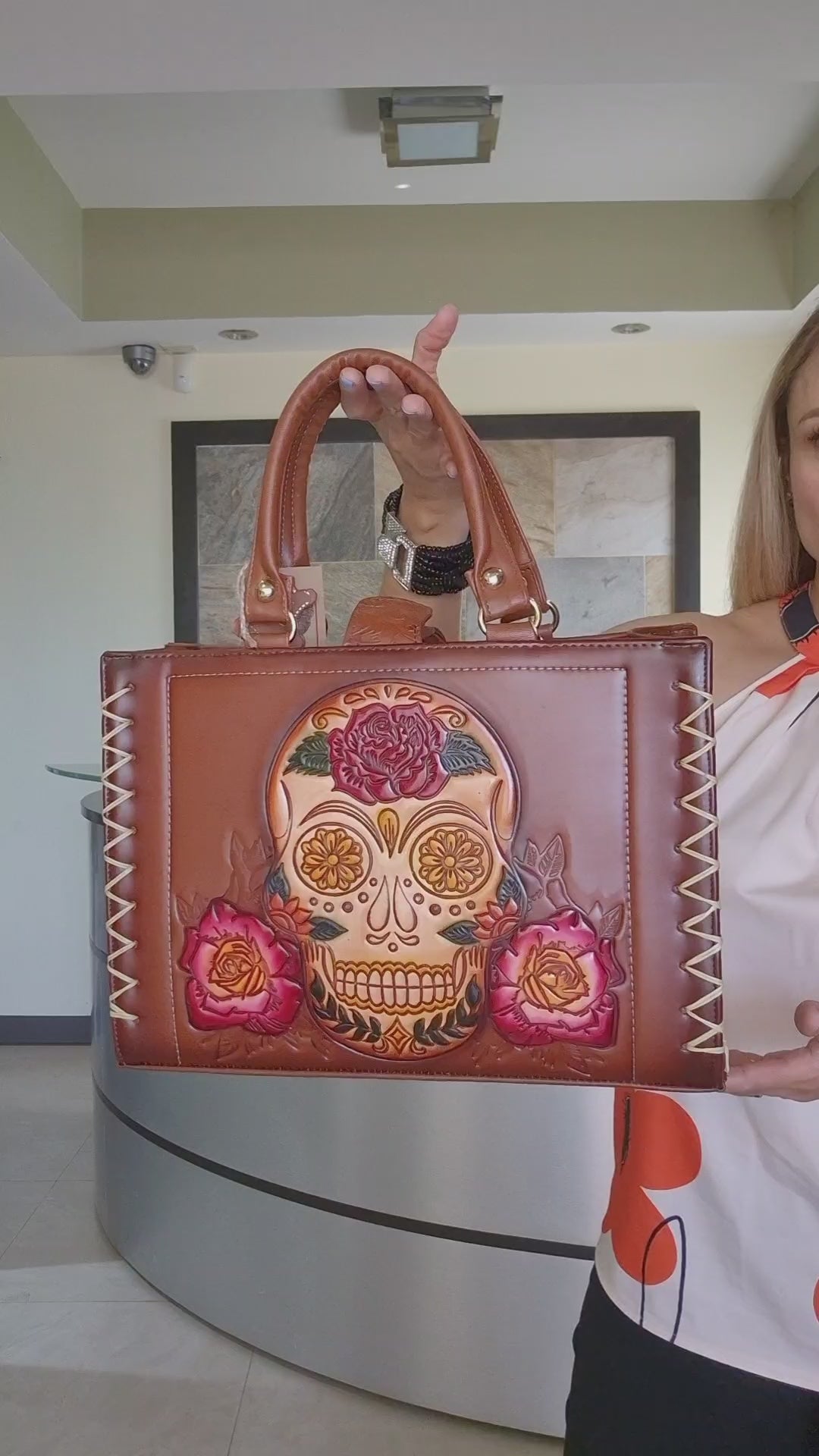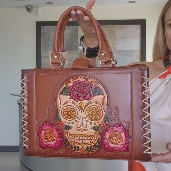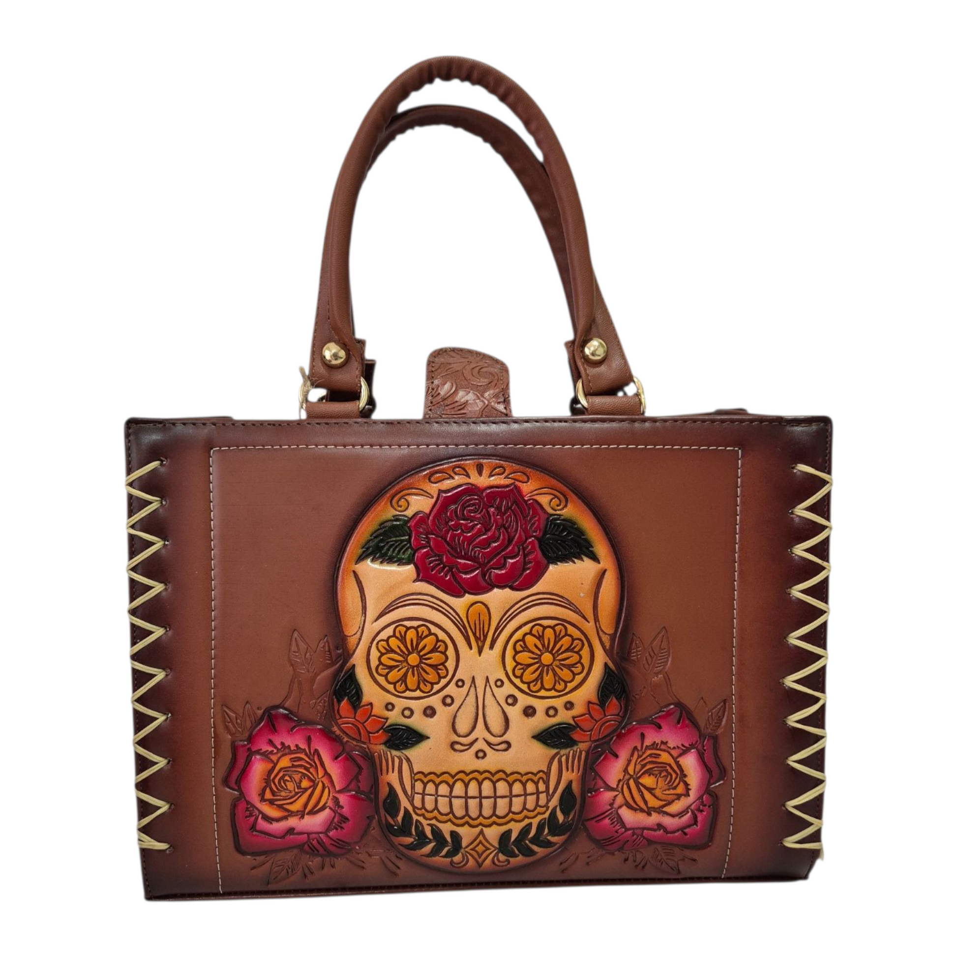 Bolsa de Mano Artesanal Color Marron con Grabado de Calavera y Rosas