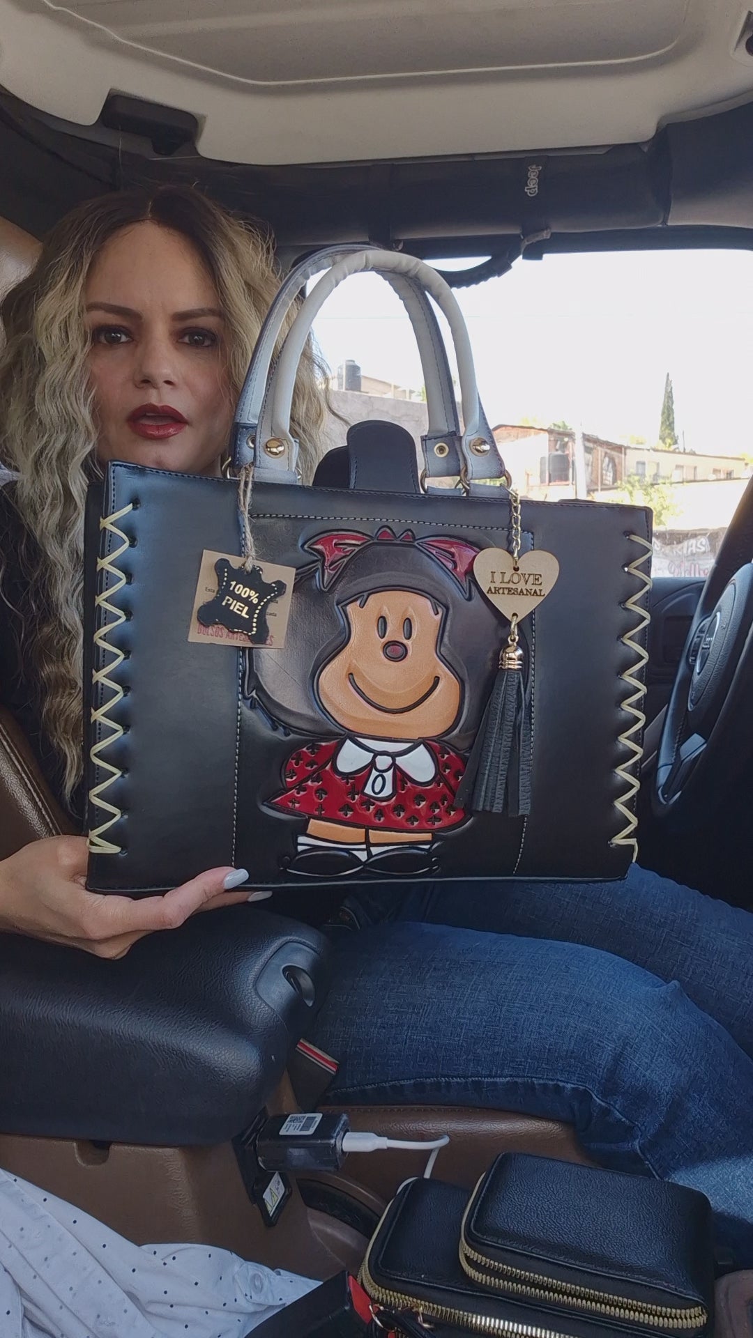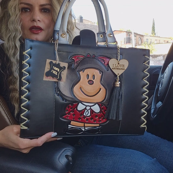 Inspirada en el icónico personaje de Mafalda, esta bolsa destaca por su diseño grabado, ideal para quienes buscan un accesorio con carácter y autenticidad.