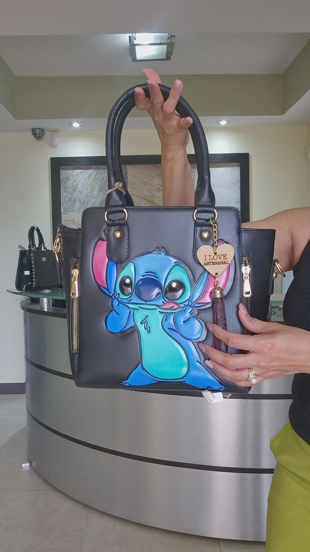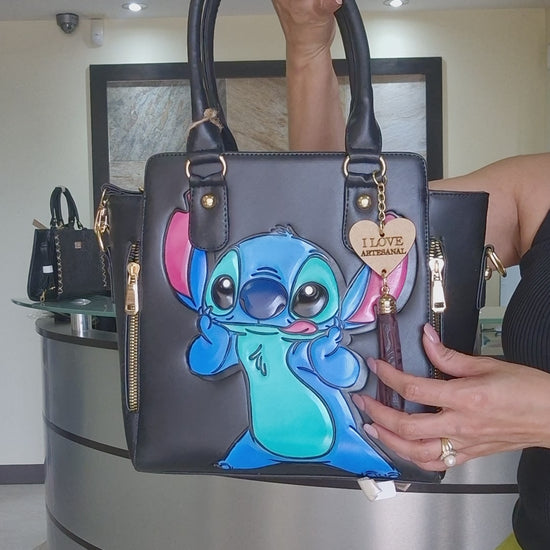 Bolsa negra artesanal con diseño animado colorido