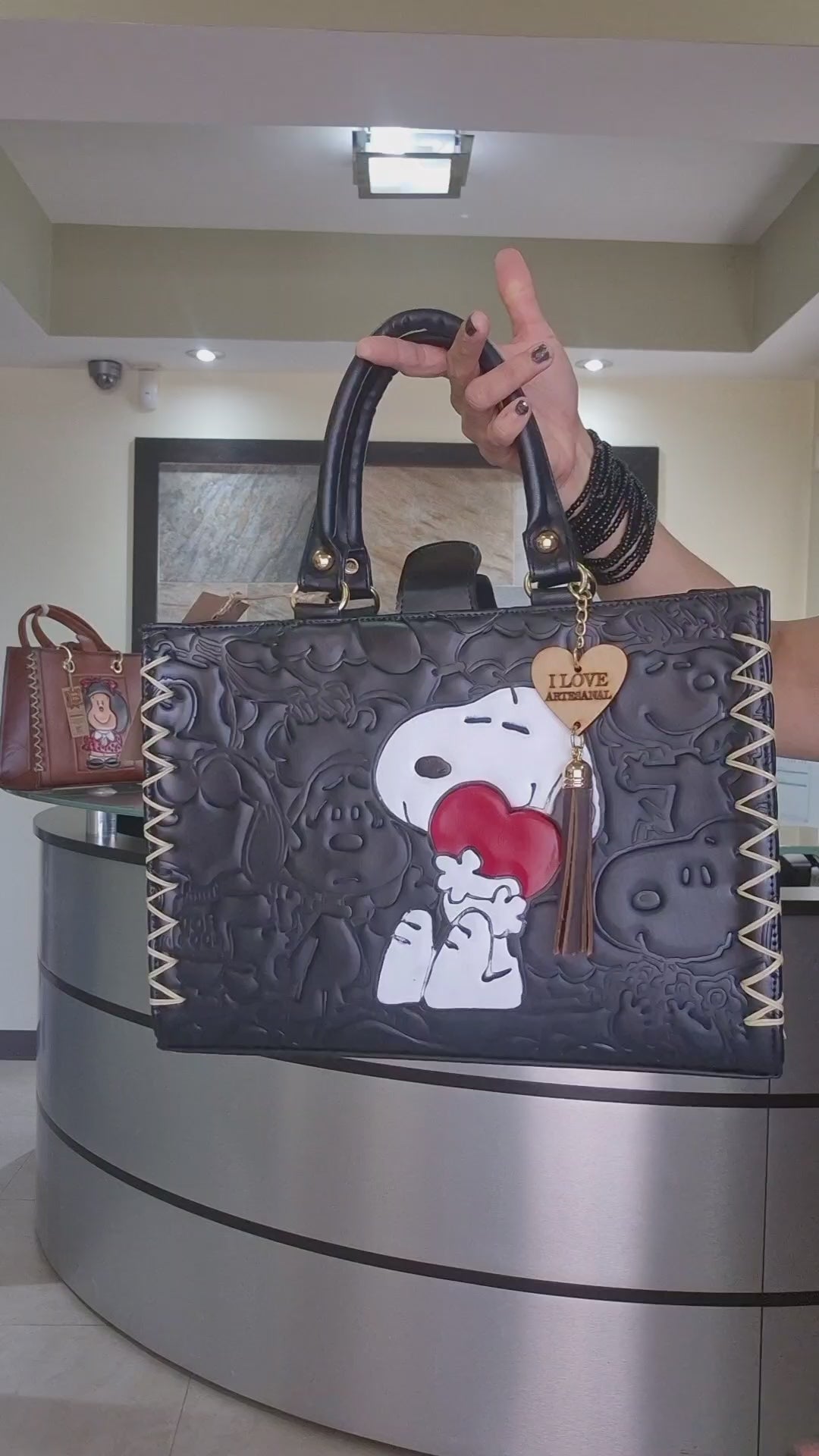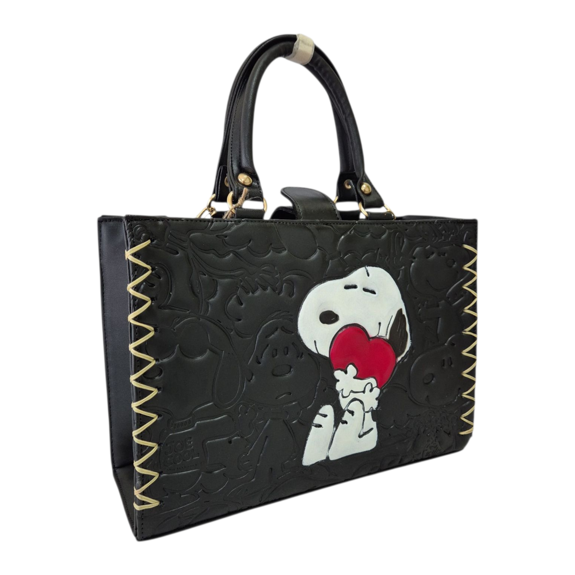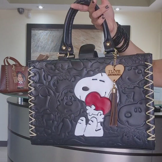 Bolsa negra artesanal de mano con diseño animado en relieve
