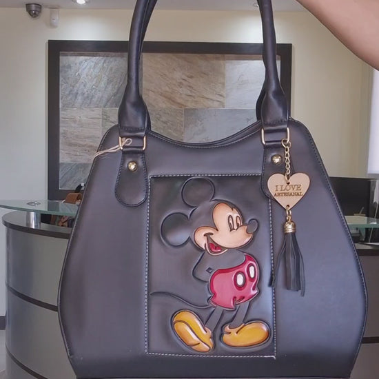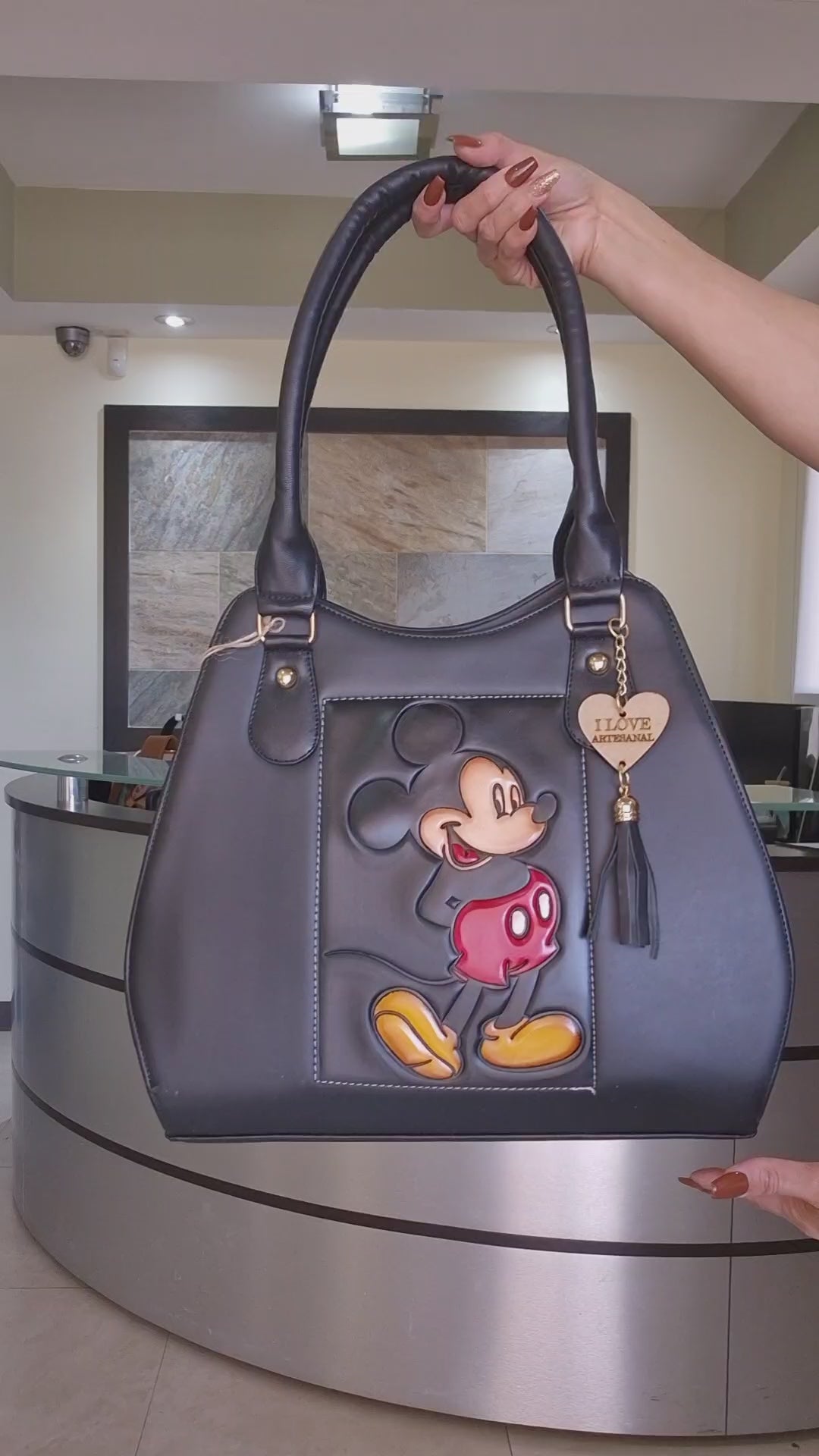 Dale un toque divertido y elegante a tu estilo diario con esta hermosa bolsa negra para mujer. Su diseño incluye un personaje animado clásico en relieve, aportando un look único y llamativo.