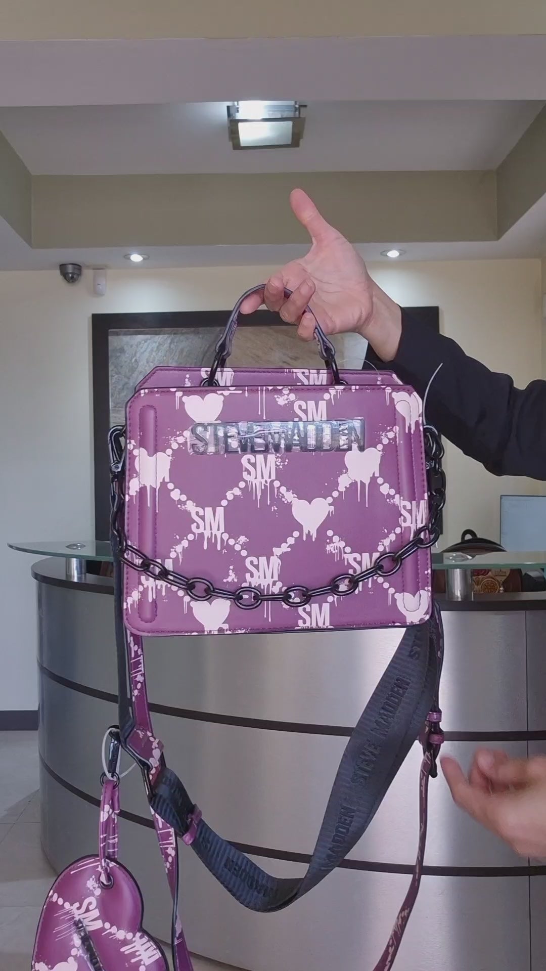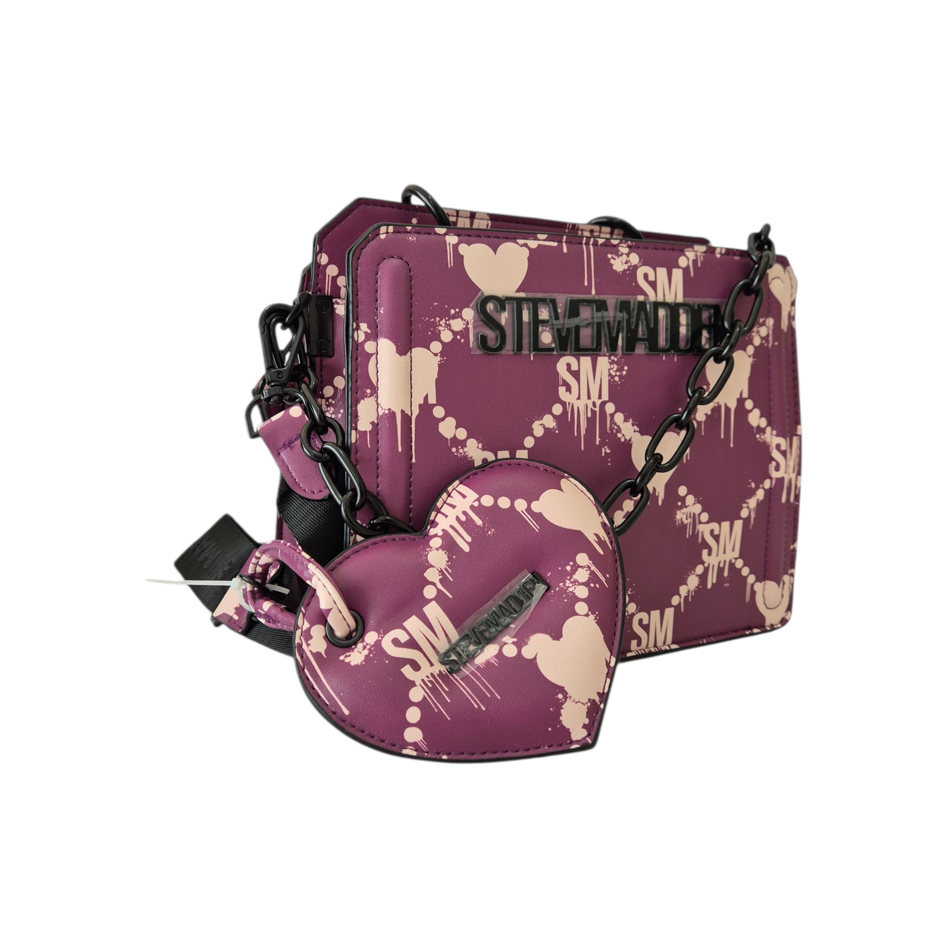 El diseño estructurado aporta elegancia, mientras que la cadena negra frontal añade un toque contemporáneo. Incluye un práctico monedero en forma de corazón, perfecto para guardar pequeños objetos con estilo y comodidad.