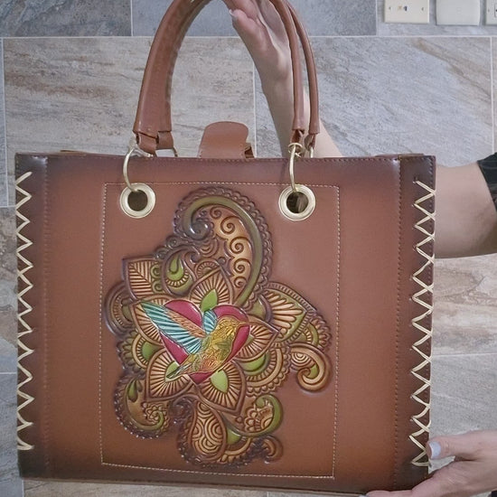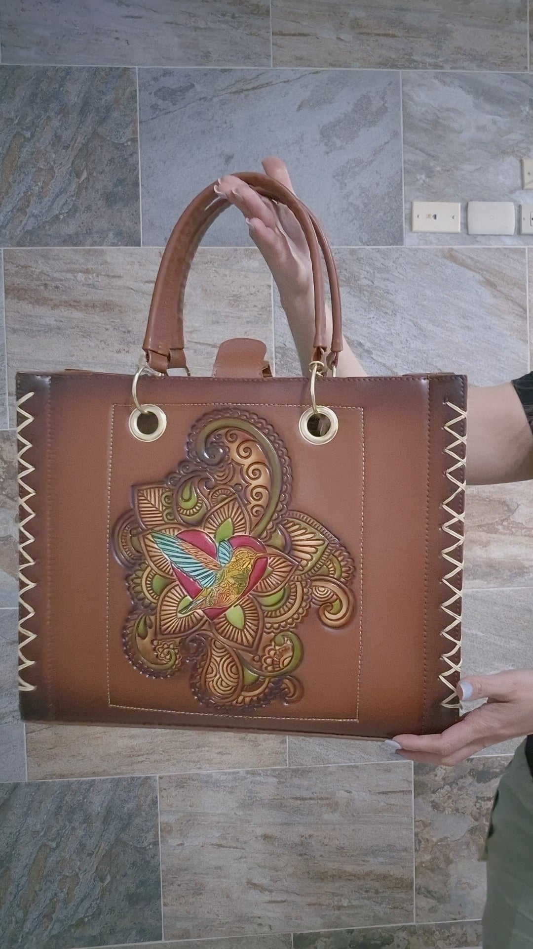 Bolsa Tote Mujer Café Artesanal Con Diseño en Relieve Colibrí Incluye Bolsa Interior