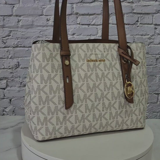Bolsa Michael Kors tote MK Signature en color beige con detalles en café, un diseño clásico y funcional ideal para el uso diario.