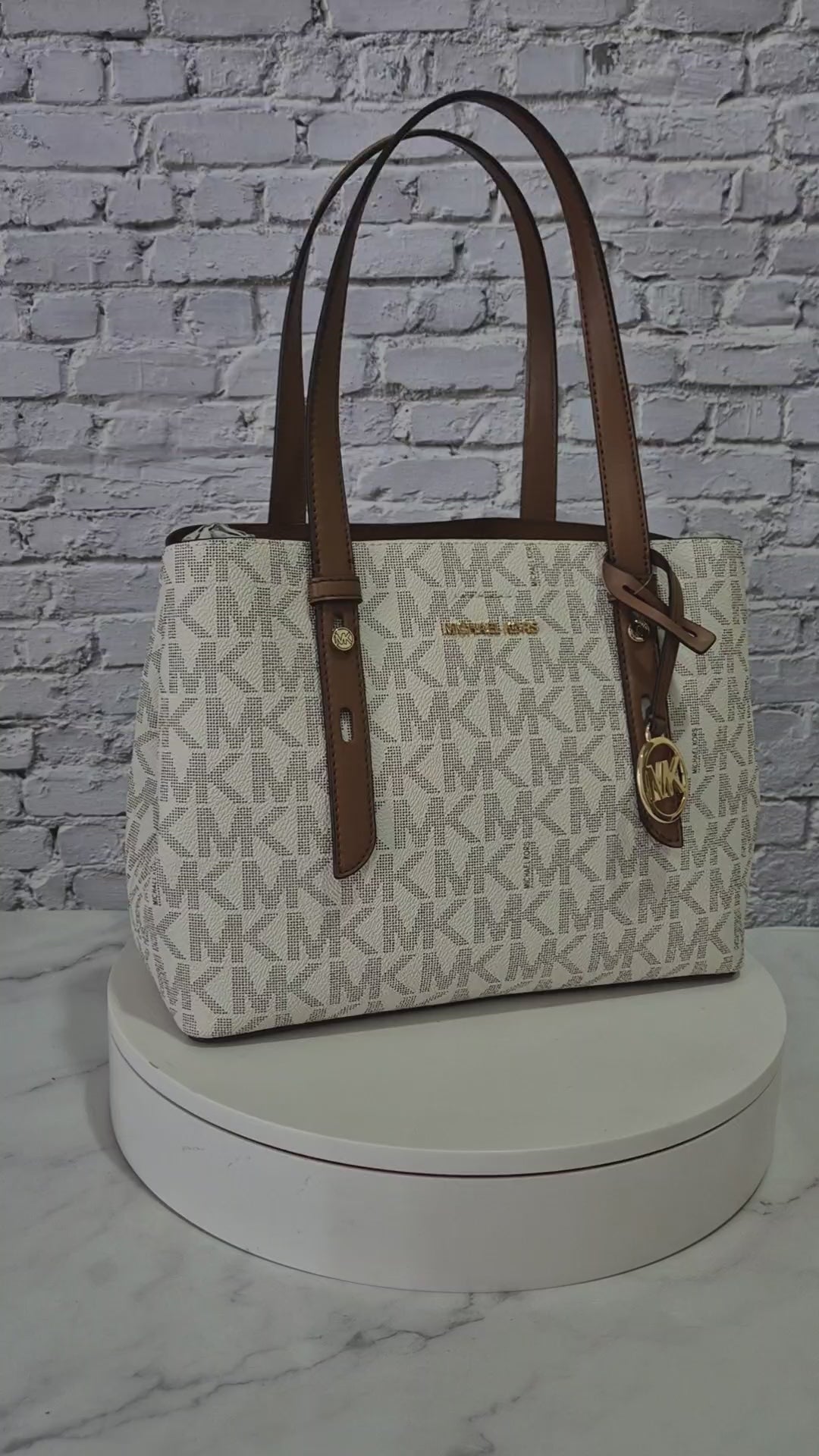 Bolsa Michael Kors tote MK Signature beige con detalles café mediana