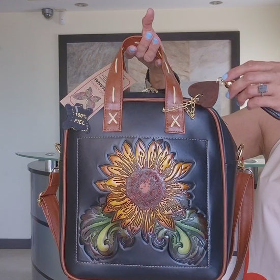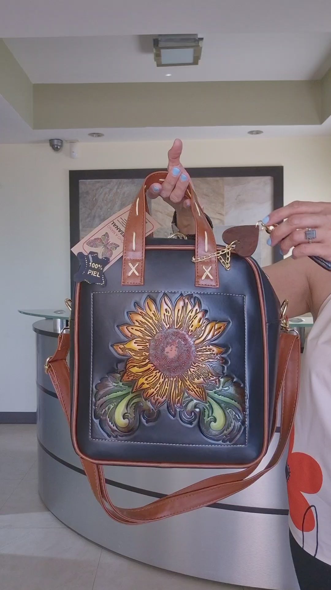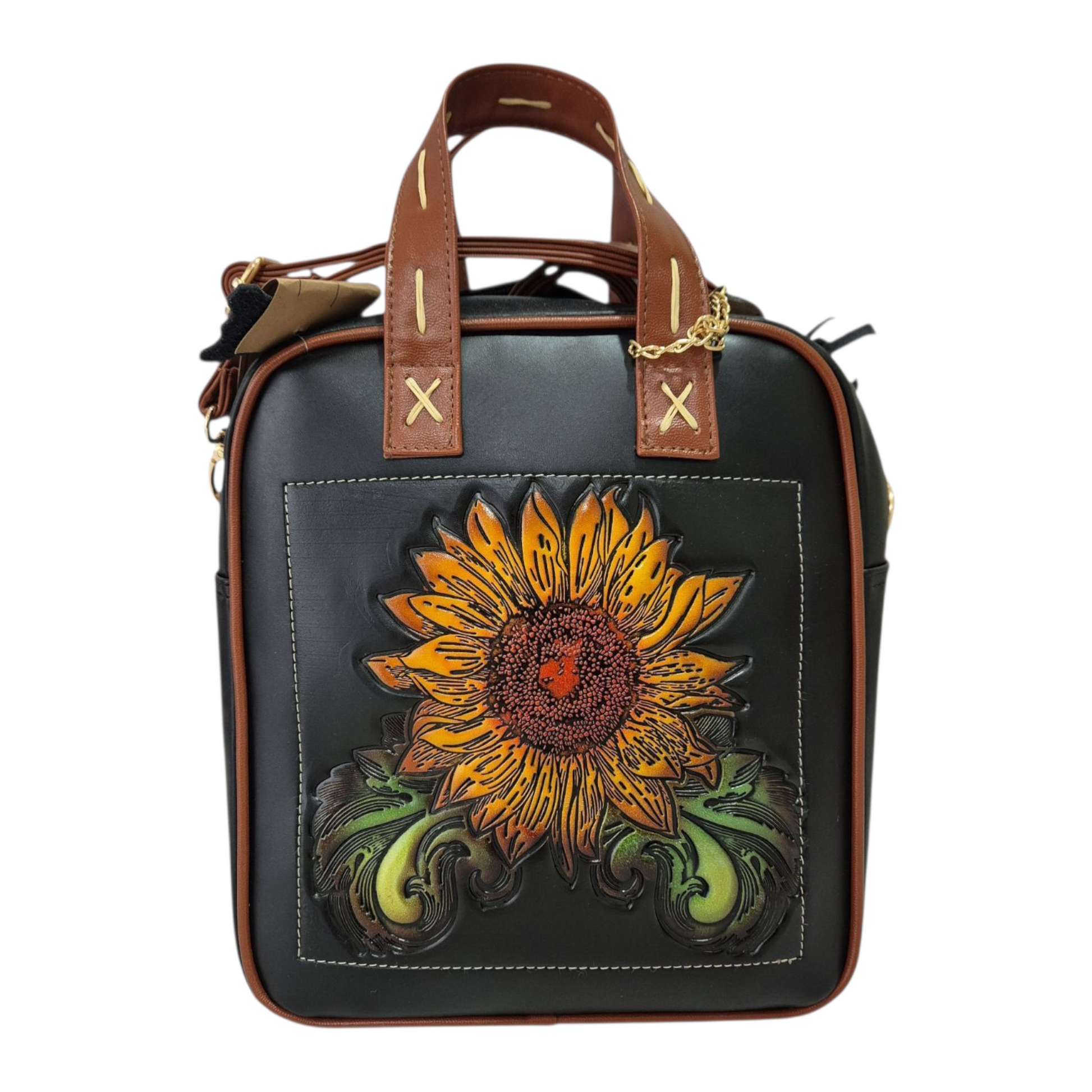 Luce un estilo único con esta bolsa y mochila artesanal, elaborada con material de alta calidad. Su diseño grabado y pintado a mano con un girasol vibrante simboliza energía, alegría y vitalidad, convirtiéndola en la compañera perfecta para tu día a día.