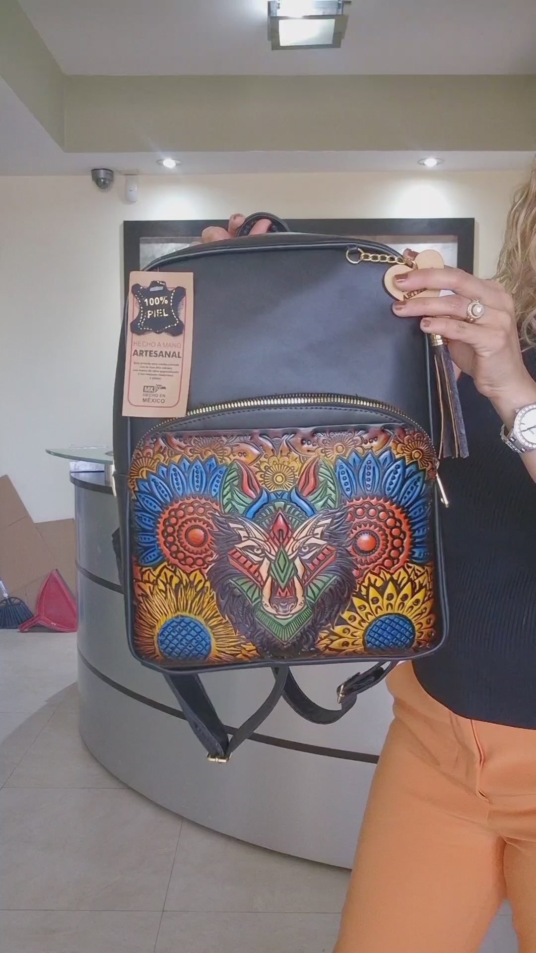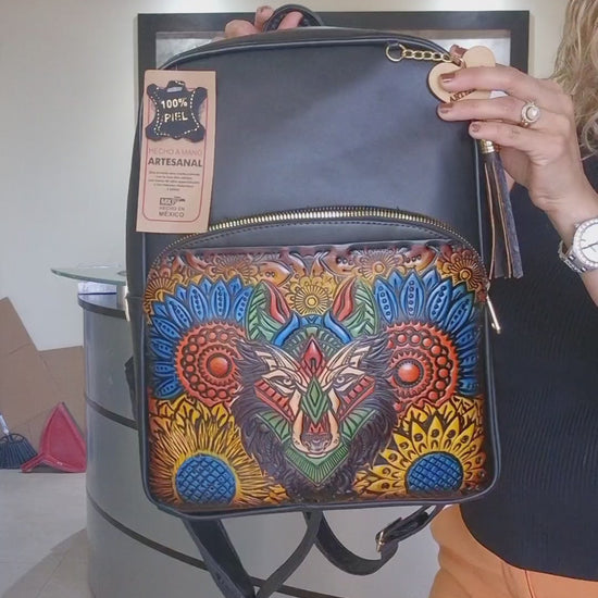 Mochila artesanal con diseño de lobo — grabado colorido, hecha a mano y con estilo único