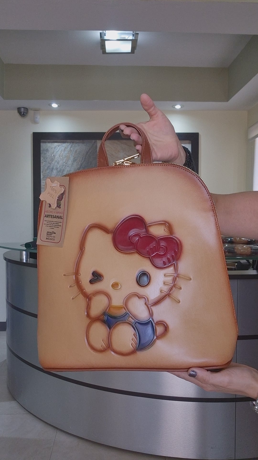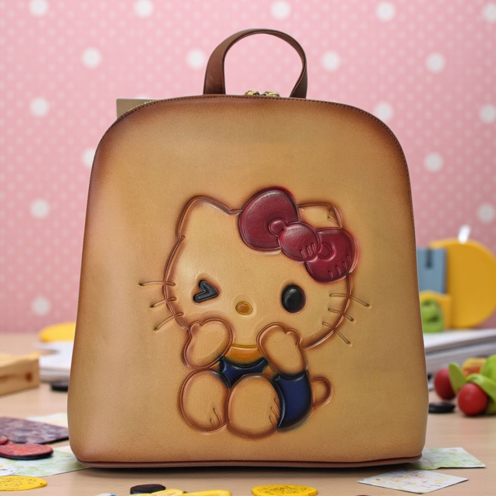 Luce un estilo único con esta mochila artesanal, cuidadosamente elaborada a mano. Su diseño grabado con un adorable personaje en relieve le da un toque divertido y original, ideal para quienes buscan un accesorio práctico y lleno de personalidad.