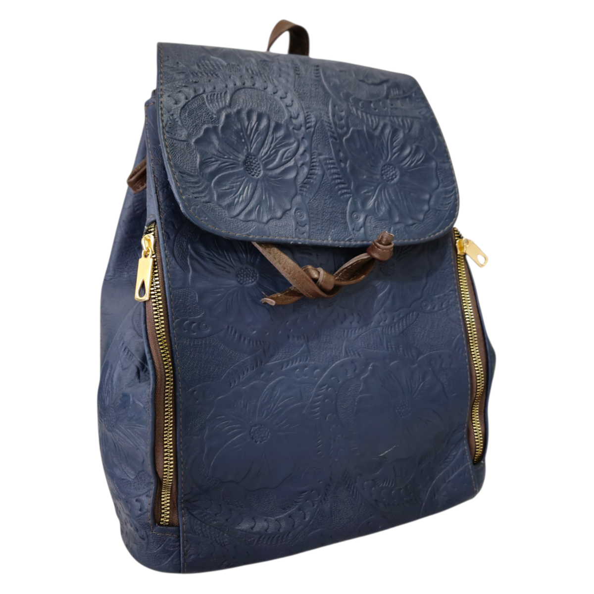 Mochila de Piel Azul Grabada Floral Artesanal