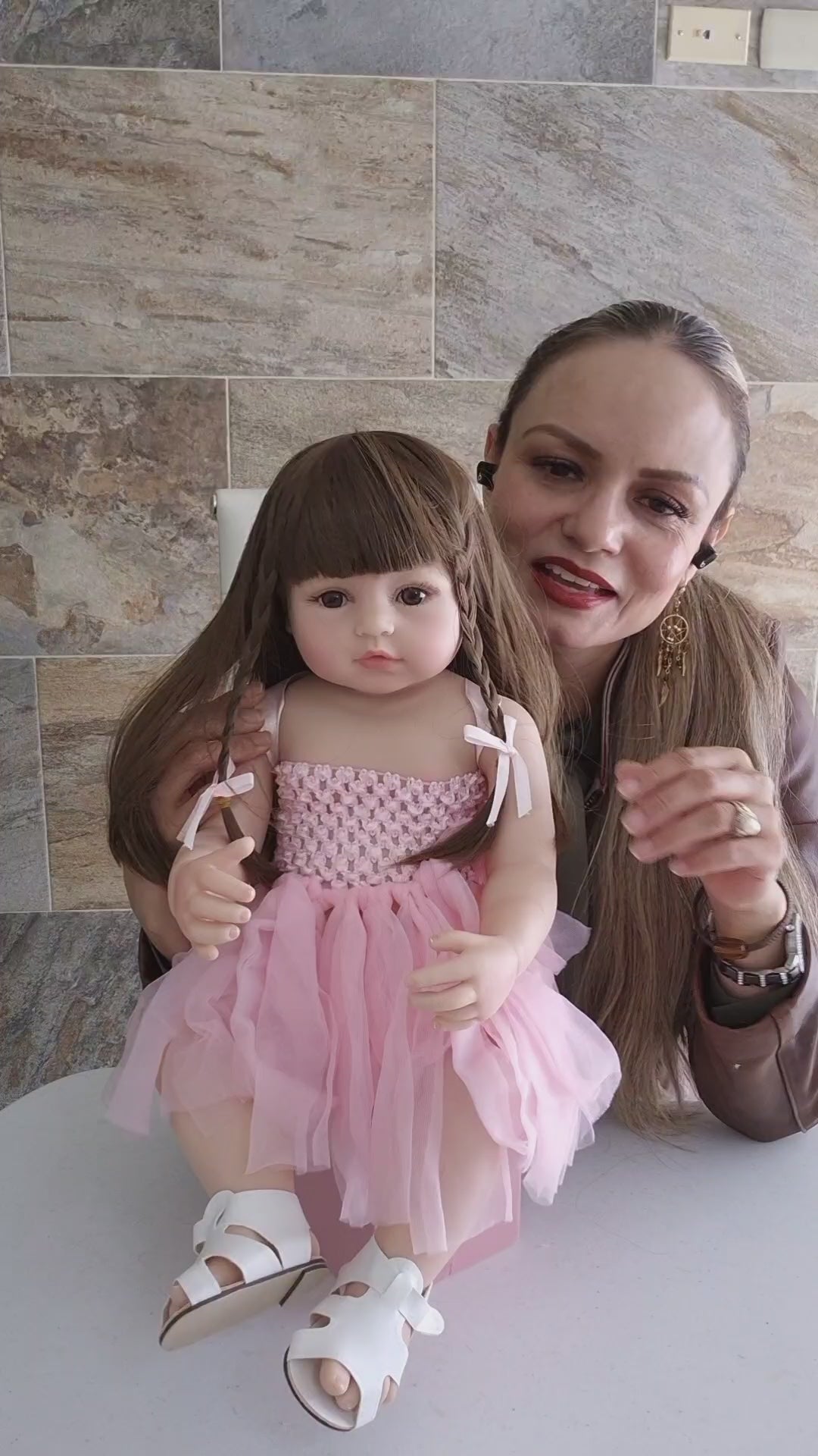 Muñeca bebé realista de vinilo 55 cm con cabello castaño y vestido rosa